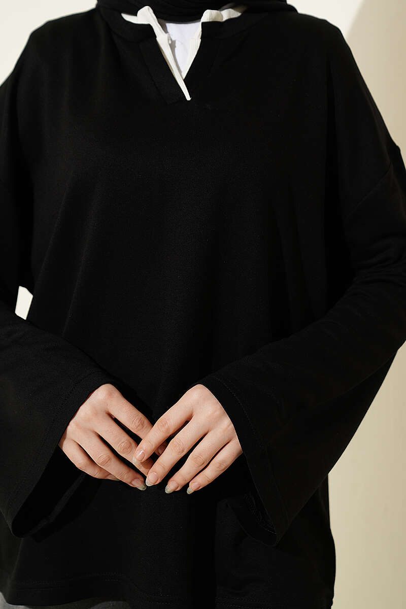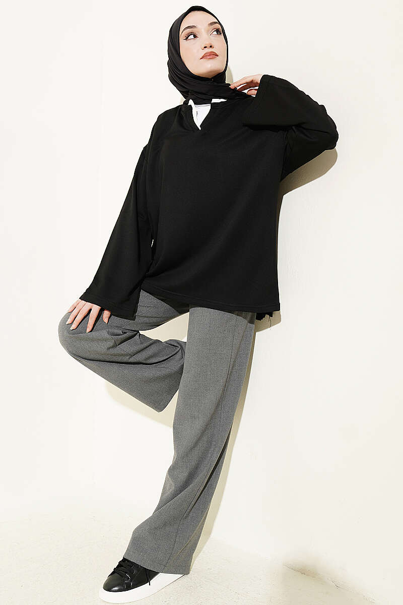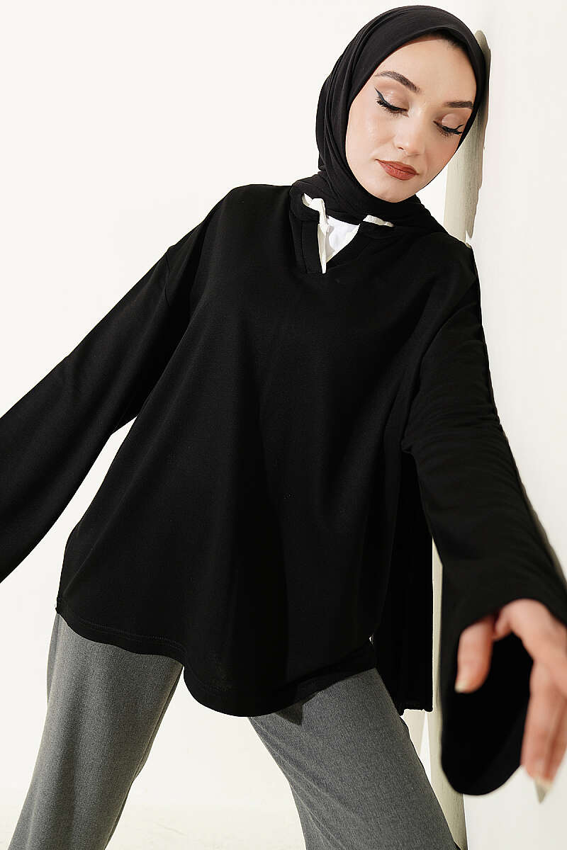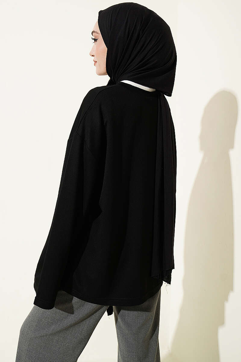 Bu tunik, hakim yaka tasarımı ve minimalist çizgileriyle modern tesettür giyimin en konforlu parçalarından biri olarak öne çıkar. Düşük omuz yapısı ve dökümlü kesimi sayesinde gün boyu hareket özgürlüğü sunarken, sade dokusuyla zahmetsiz bir şıklık vadeder. Boyun kısmındaki zarif dekolte detayı, klasik tunik formuna yenilikçi bir dokunuş katarak hem spor hem de günlük kombinlere kolayca uyum sağlar. Yumuşak kumaş dokusu ve zamansız tasarımıyla gardırobunuzun en işlevsel ve rahat parçalarından biri olmaya adaydır.