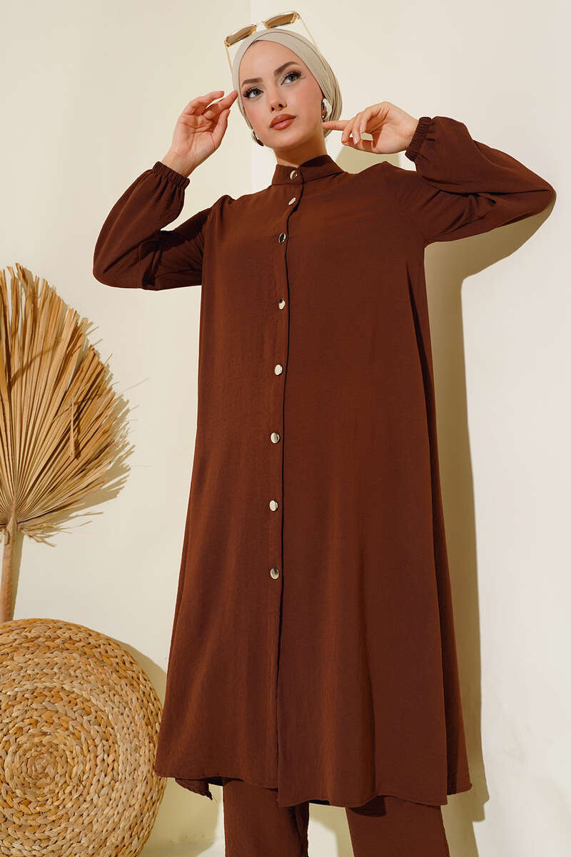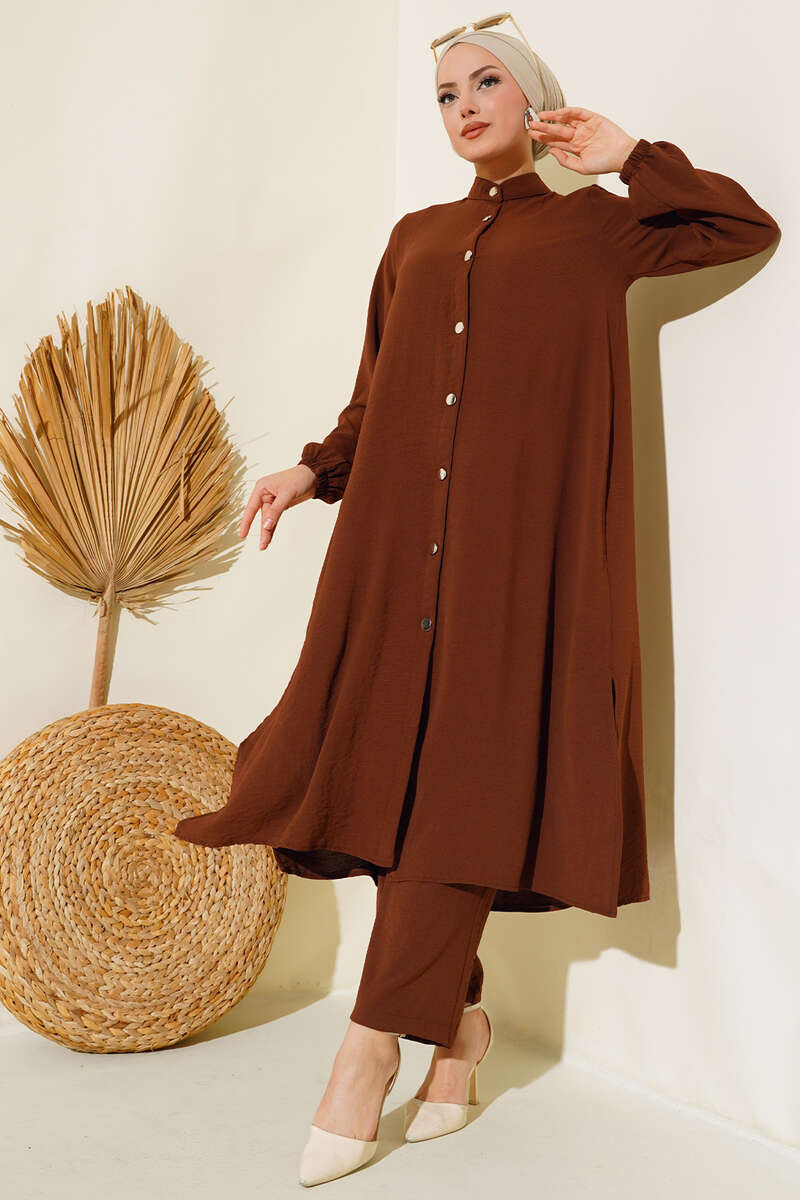 Yeni sezon ikili takımımız sizlerle beraber. Tuniğimizin yakası hakim yakadır. Kol bilekleri lastiklidir. Boydan metal düğmelidir. Yanları yırtmaçlıdır. Arkasında bir adet katı ve  metal düğmesi bulunur. Kloş bir yapıya sahiptir. Pantolonumuzun beli lastikli olup dar paça ve cepsizdir. Takımızın renk seçenekleri mevcuttur.