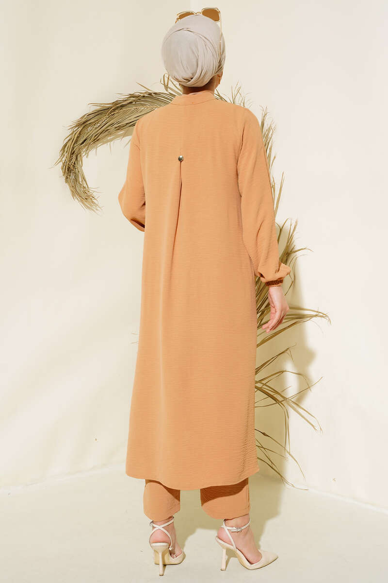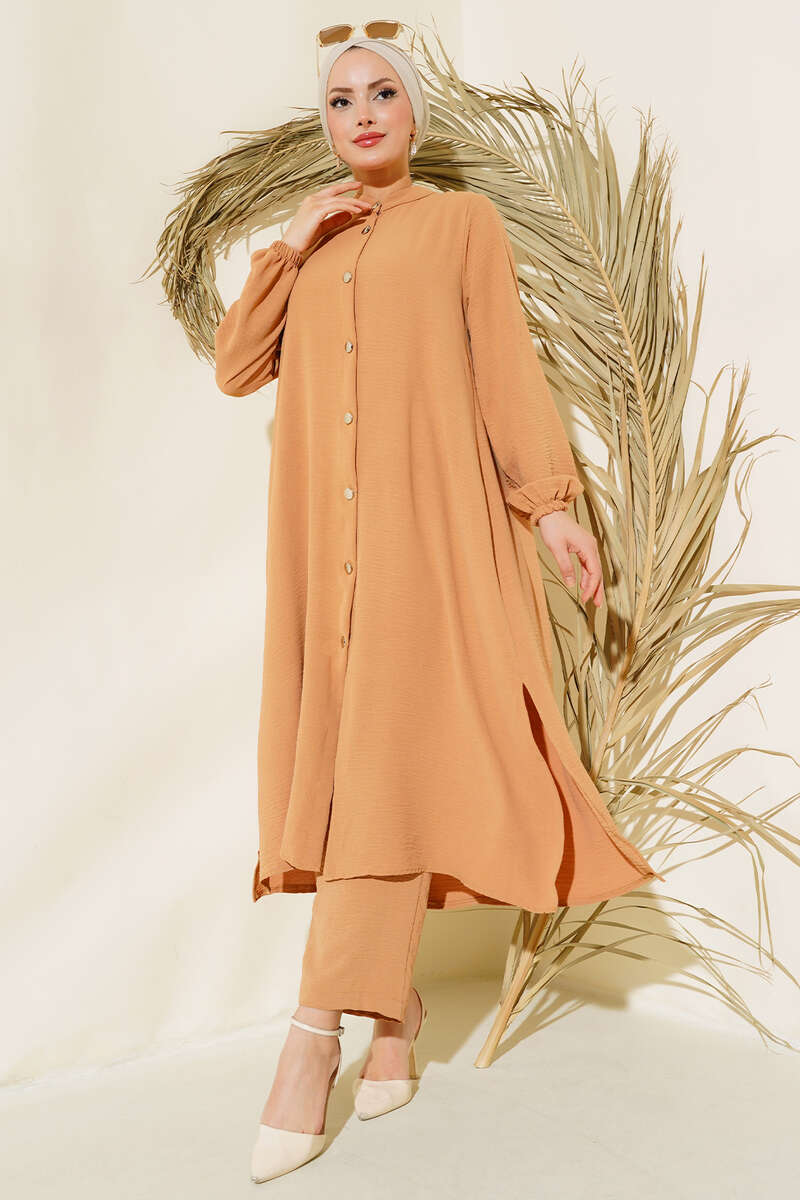 Yeni sezon ikili takımımız sizlerle beraber. Tuniğimizin yakası hakim yakadır. Kol bilekleri lastiklidir. Boydan metal düğmelidir. Yanları yırtmaçlıdır. Arkasında bir adet katı ve  metal düğmesi bulunur. Kloş bir yapıya sahiptir. Pantolonumuzun beli lastikli olup dar paça ve cepsizdir. Takımızın renk seçenekleri mevcuttur.