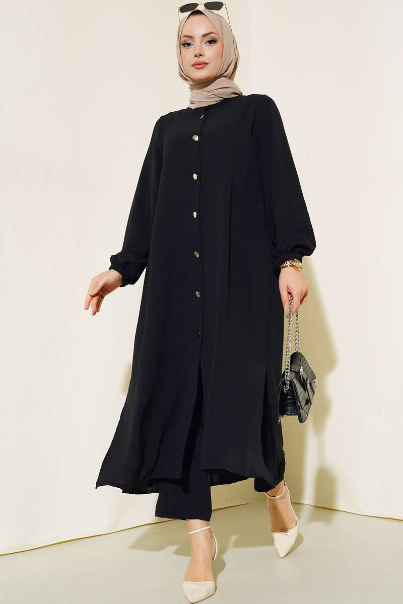 Yeni sezon ikili takımımız sizlerle beraber. Tuniğimizin yakası hakim yakadır. Kol bilekleri lastiklidir. Boydan metal düğmelidir. Yanları yırtmaçlıdır. Arkasında bir adet katı ve  metal düğmesi bulunur. Kloş bir yapıya sahiptir. Pantolonumuzun beli lastikli olup dar paça ve cepsizdir. Takımızın renk seçenekleri mevcuttur.