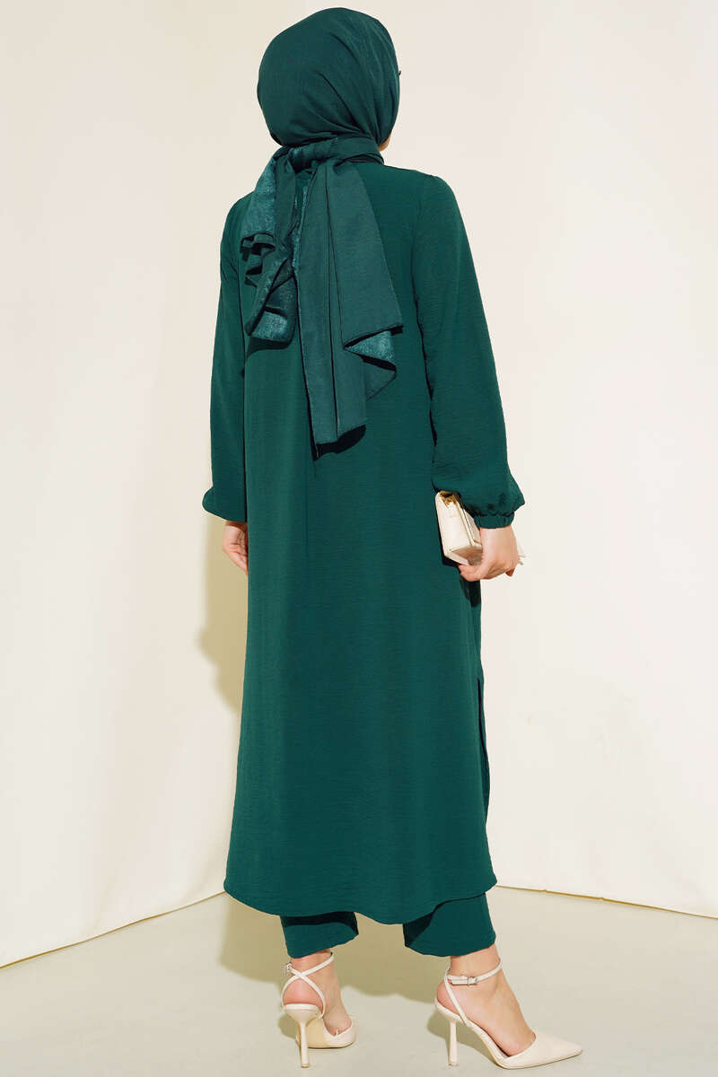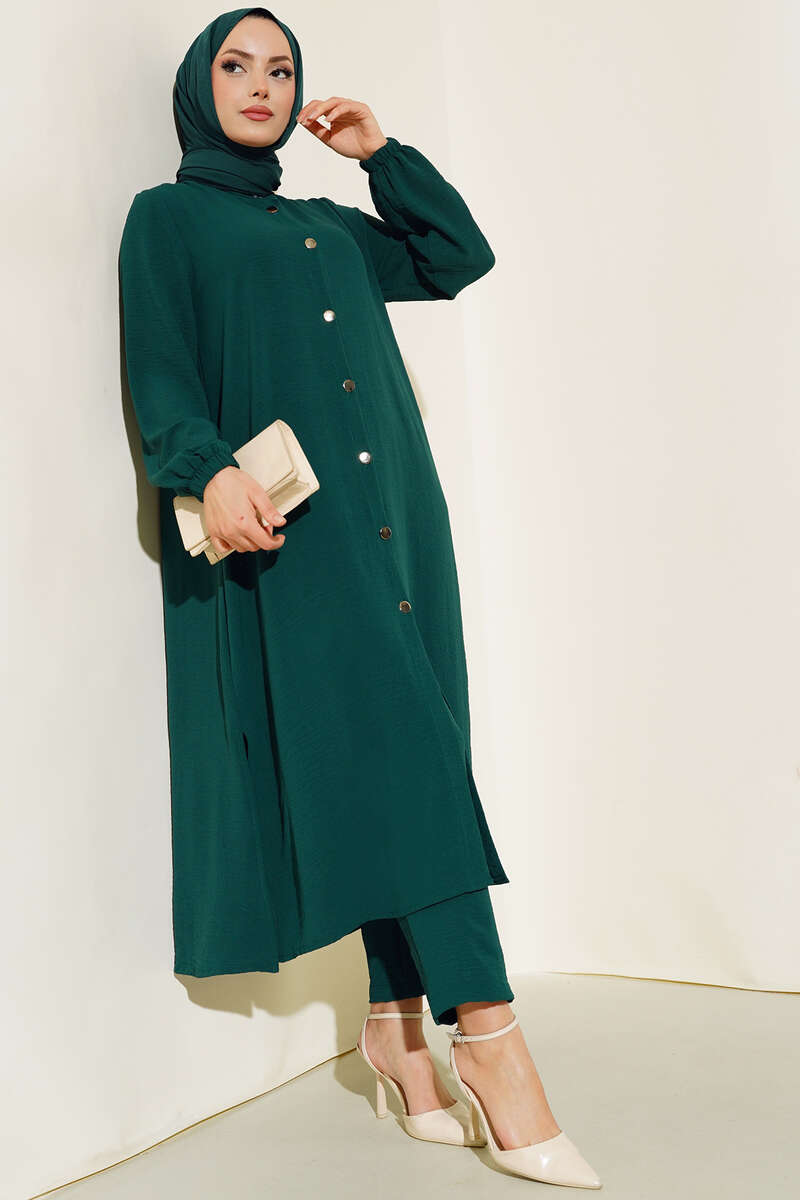 Yeni sezon ikili takımımız sizlerle beraber. Tuniğimizin yakası hakim yakadır. Kol bilekleri lastiklidir. Boydan metal düğmelidir. Yanları yırtmaçlıdır. Arkasında bir adet katı ve metal düğmesi bulunur. Kloş bir yapıya sahiptir. Pantolonumuzun beli lastikli olup dar paça ve cepsizdir. Takımızın renk seçenekleri mevcuttur.