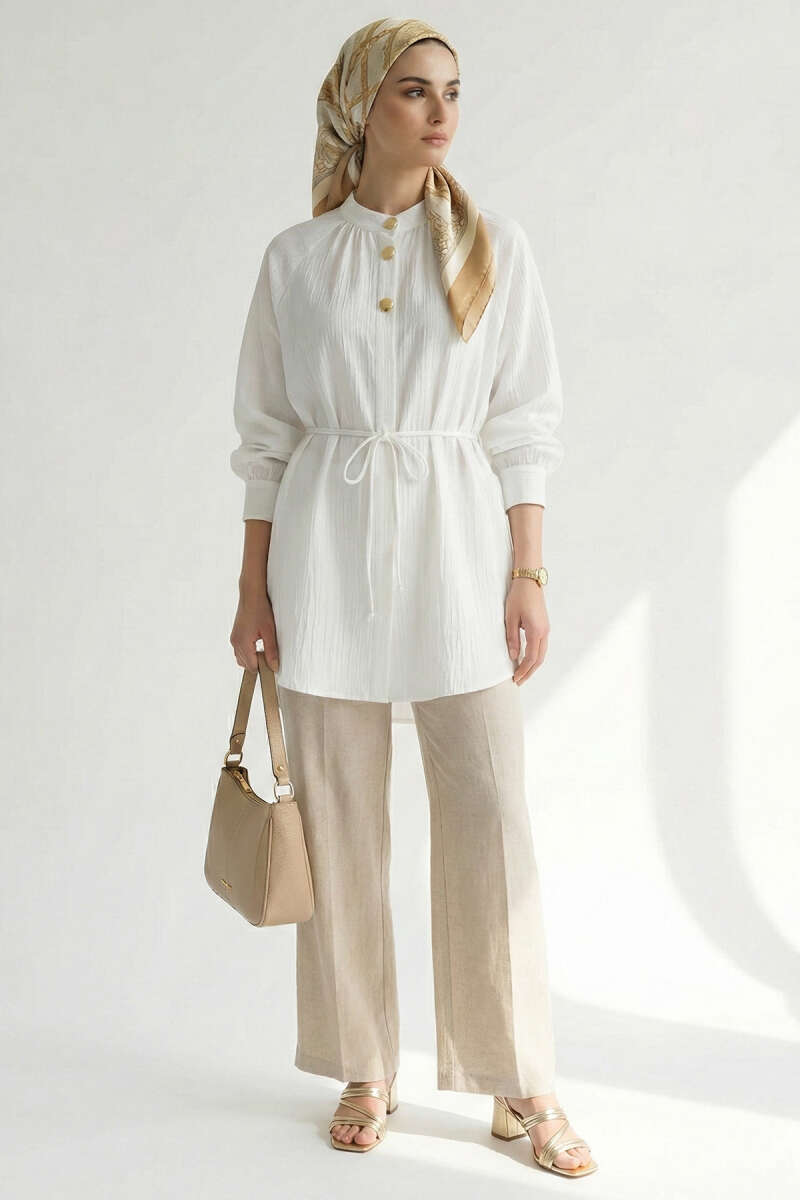 Yaka Fiyonklu Salaş Gömlek Beyaz