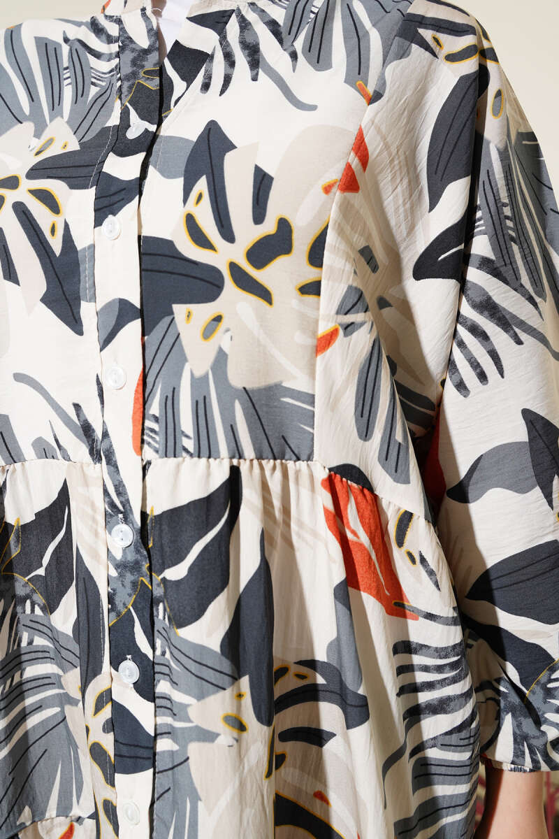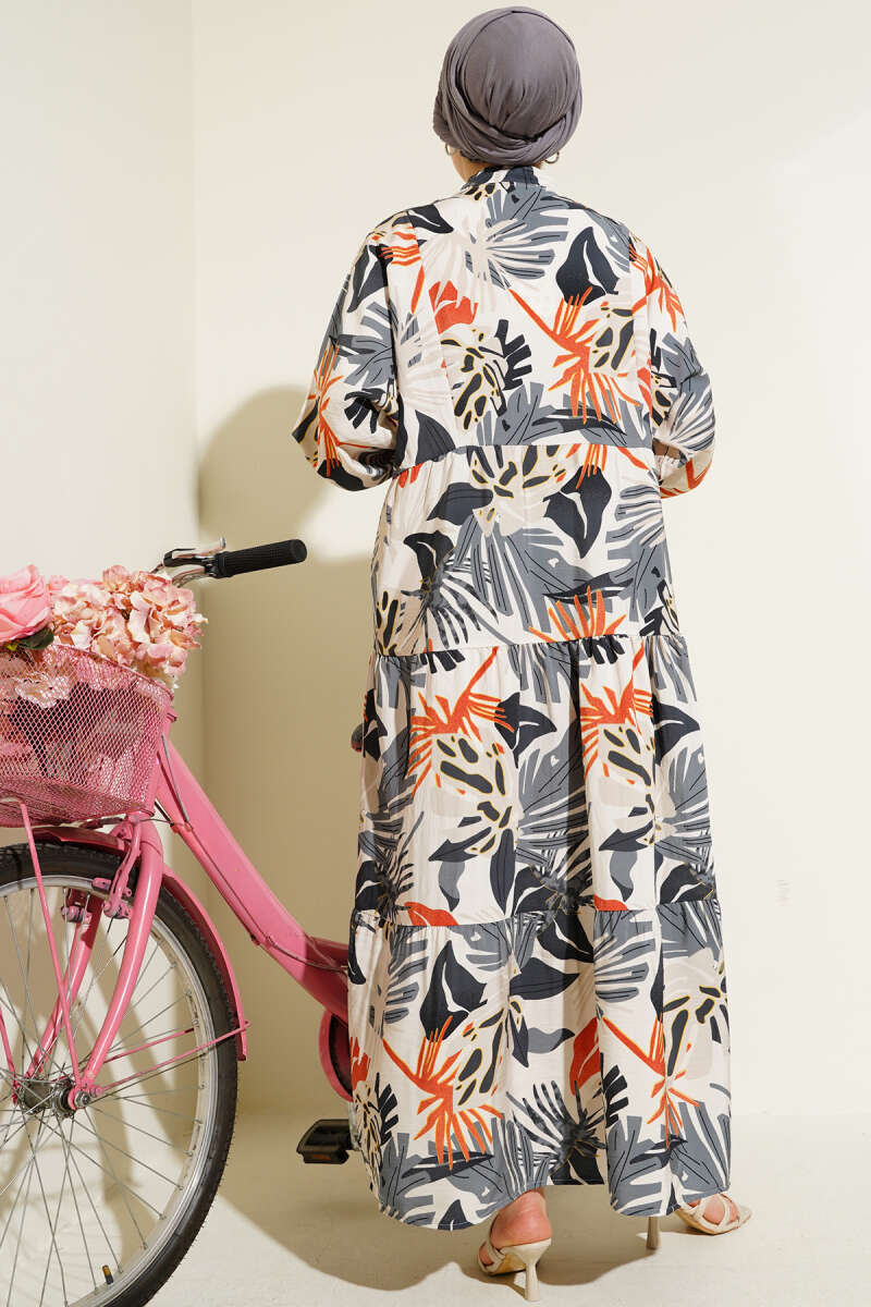 Hakim Yaka Tropik Desen Elbise Füme