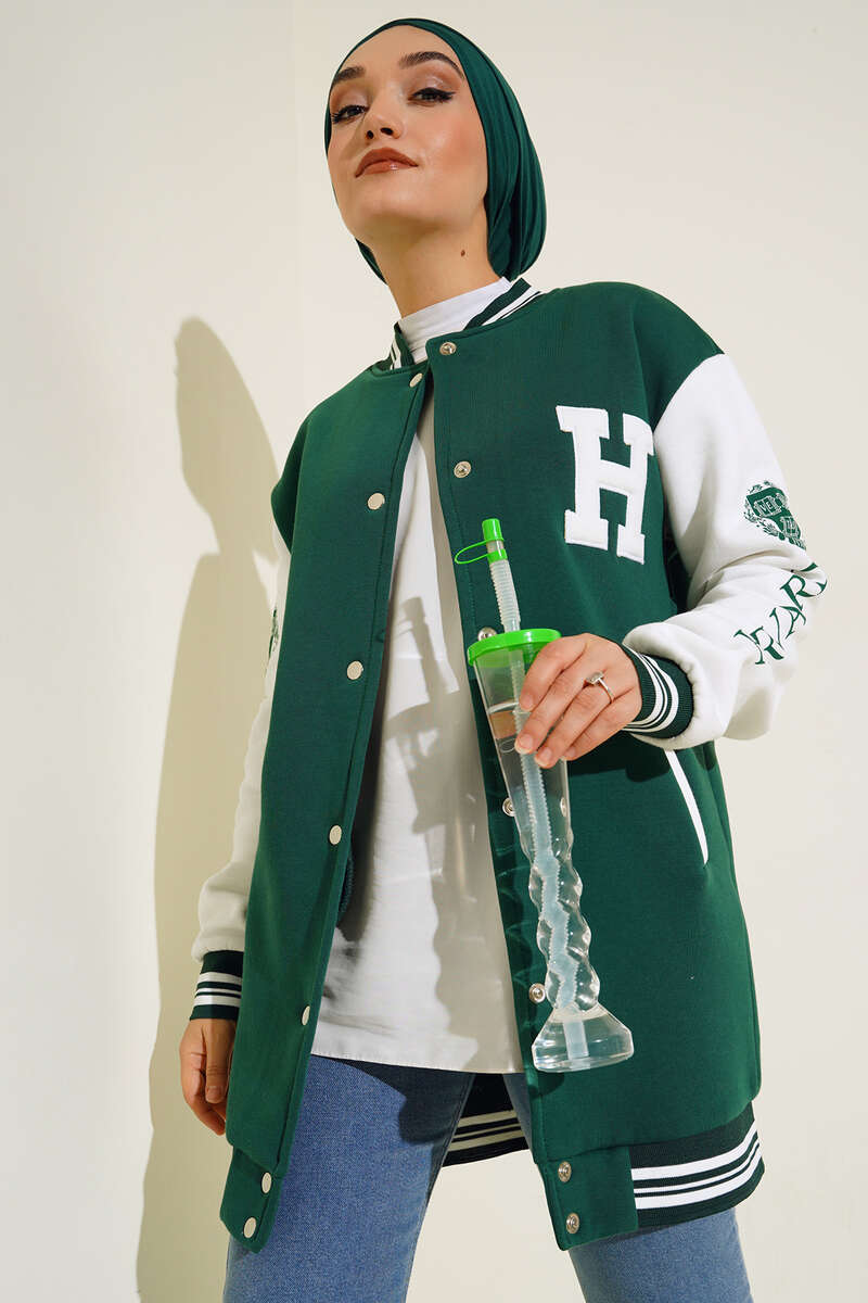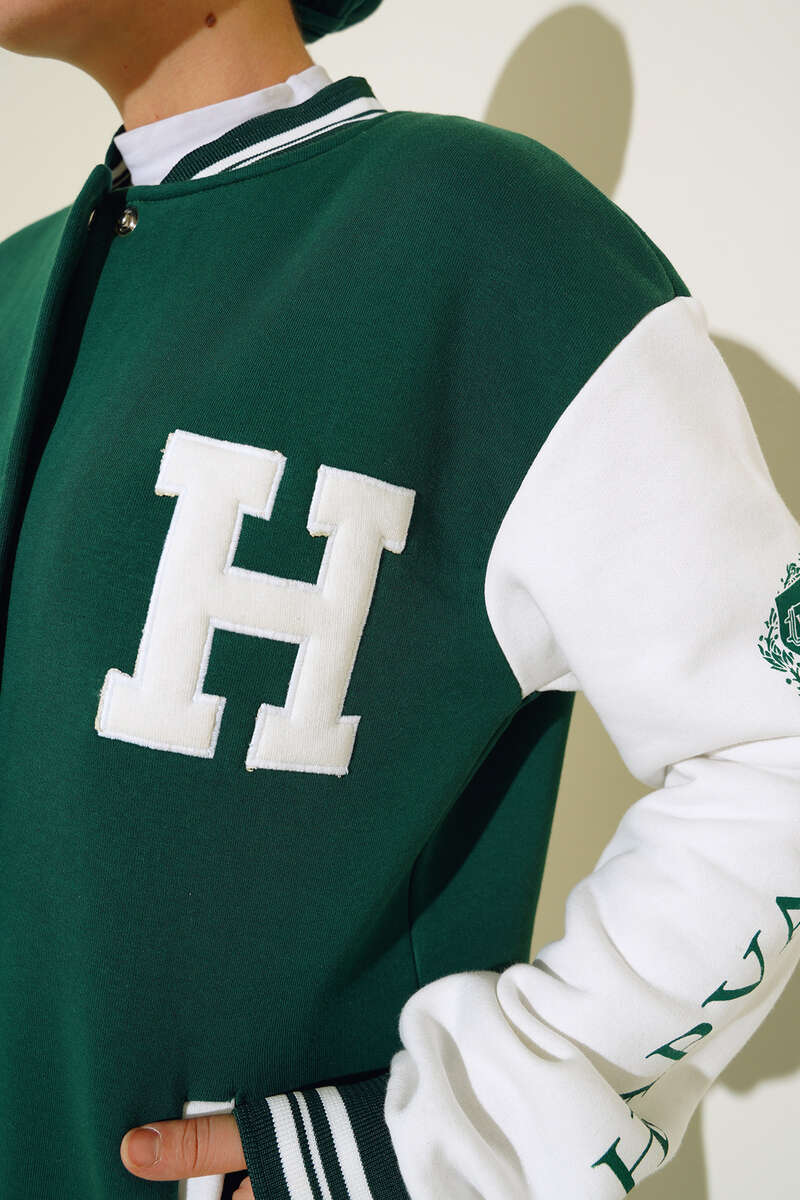Yeni sezon kolej ceketimiz kollarında bulunan harvard baskısıyla dikkat çekmektedir. Boydan çıtçıt düğmeli olan ceketimiz iki adet cebe sahipir. Cepleri kullanılabilmektedir. Göğsünde bulunan H baskısı ayırt edici özelliği olmuştur. İçi astarsızdır.