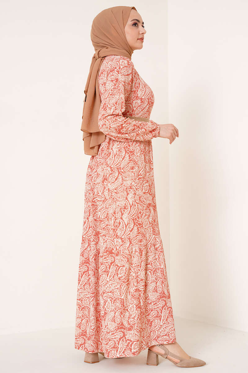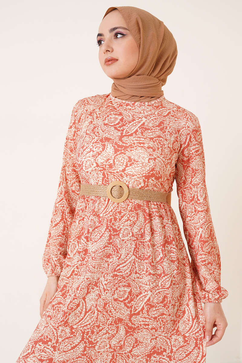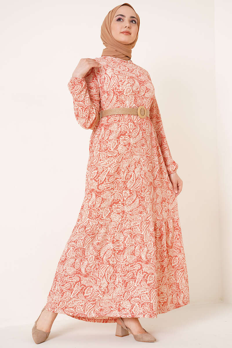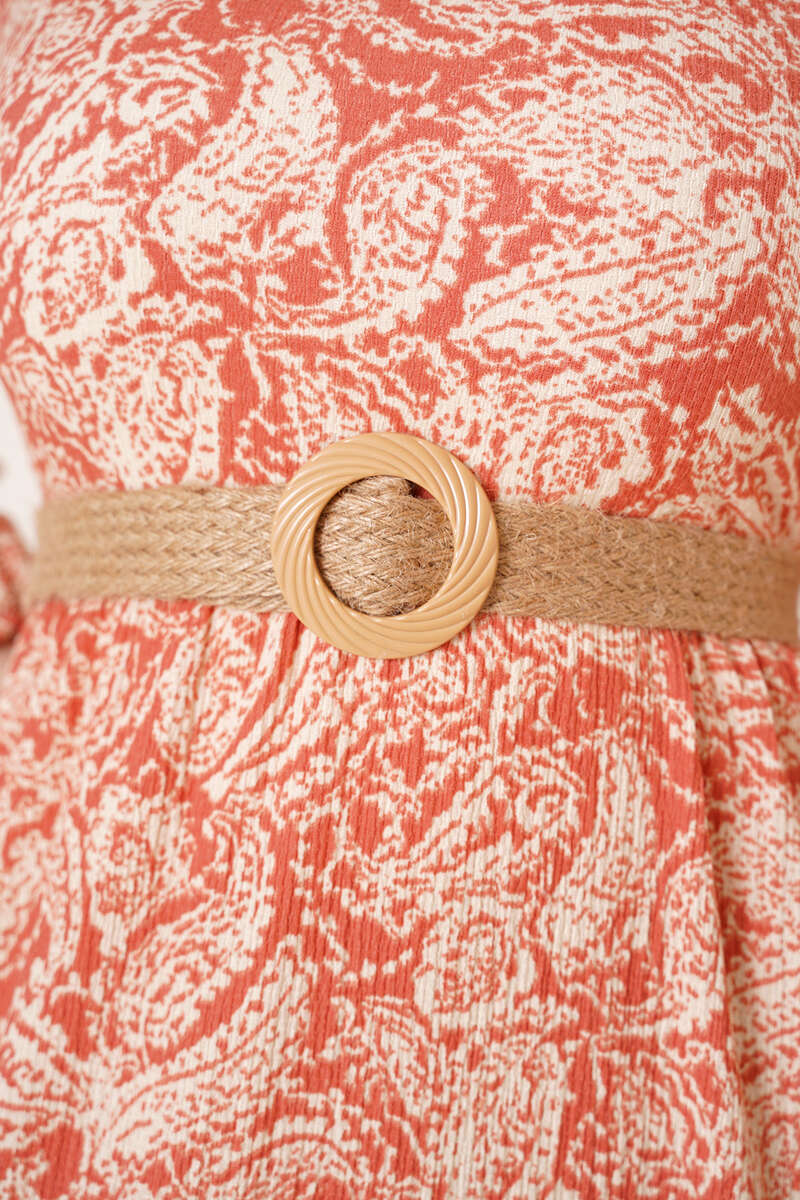 Hasır Kemerli Desenli Elbise Gül Kurusu