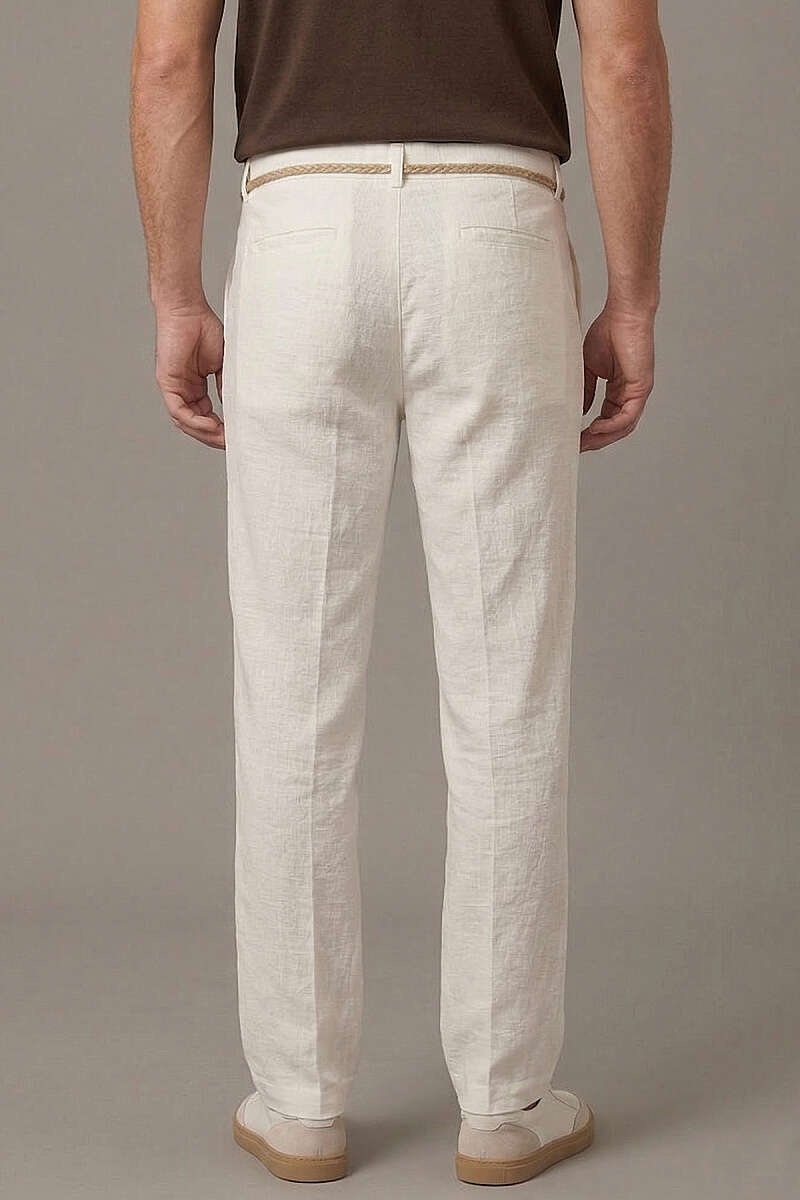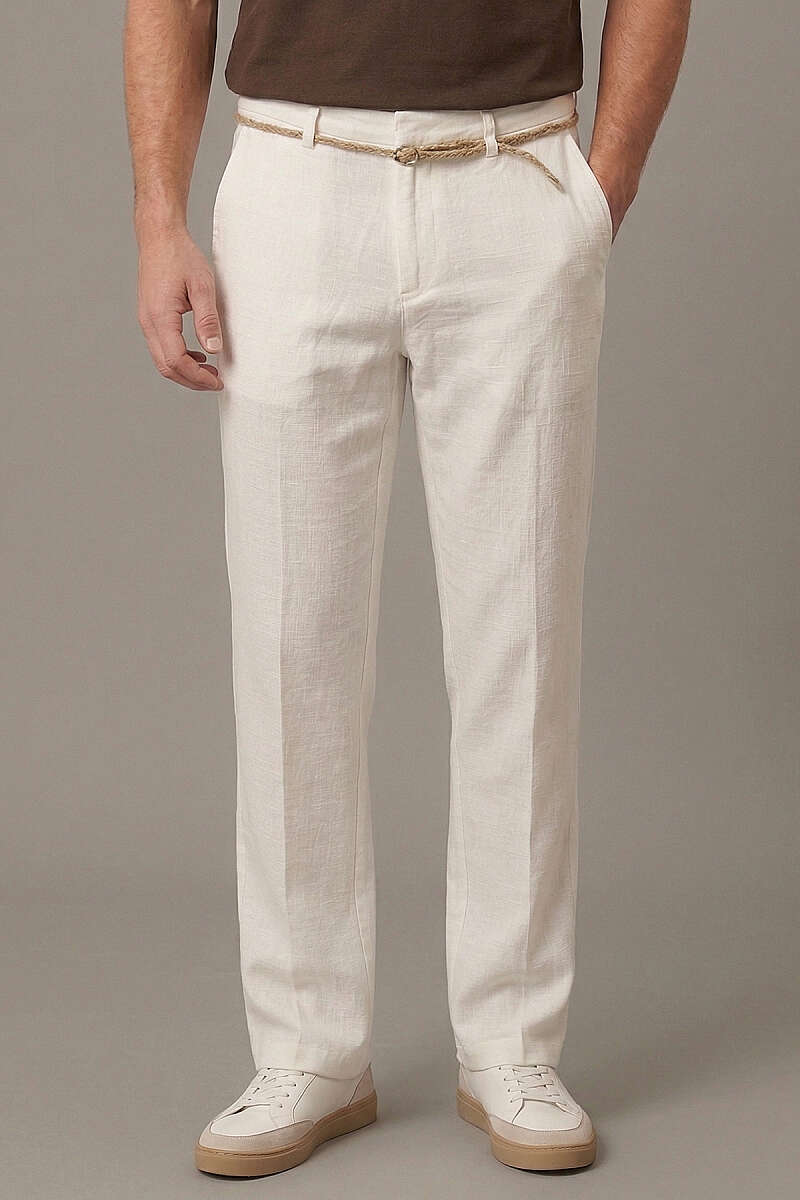 Hasır Kemerli Keten Erkek Pantolon Beyaz