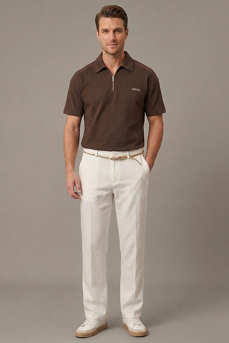 Hasır Kemerli Keten Erkek Pantolon Kahve