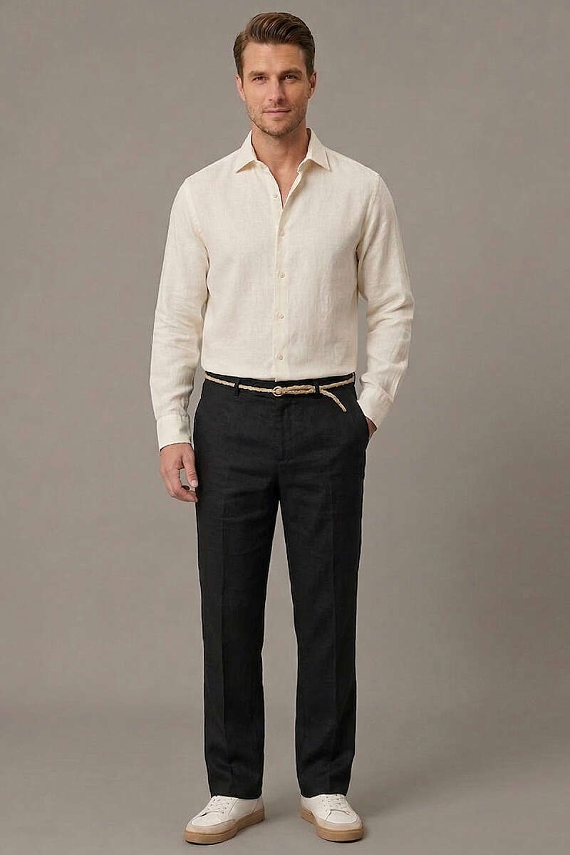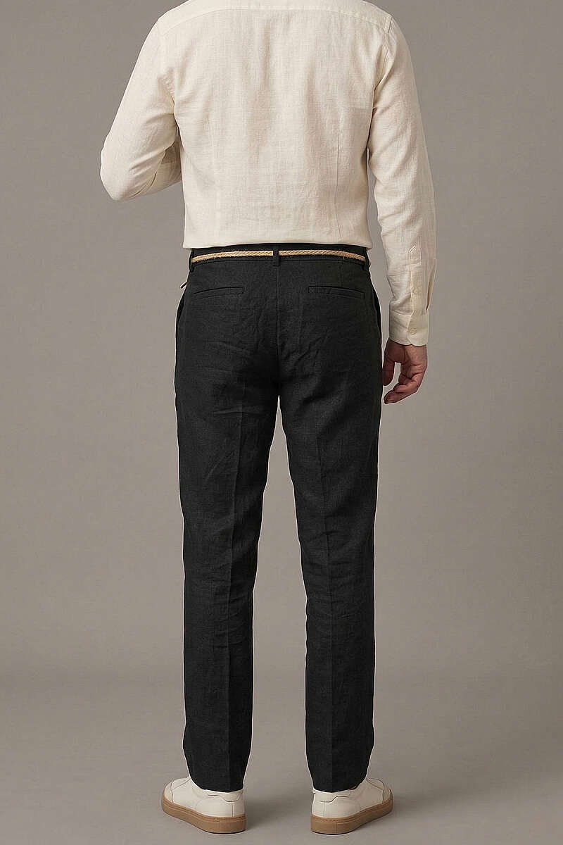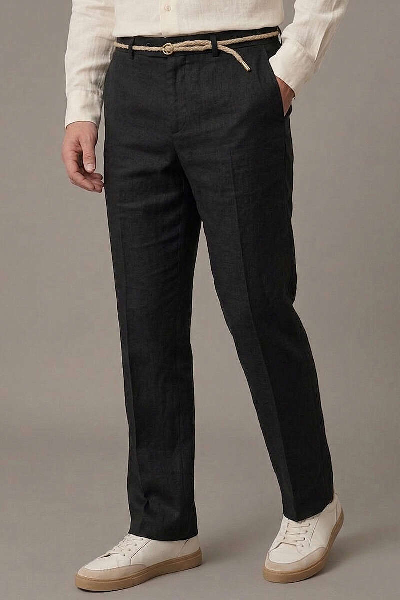 Hasır Kemerli Keten Erkek Pantolon Siyah