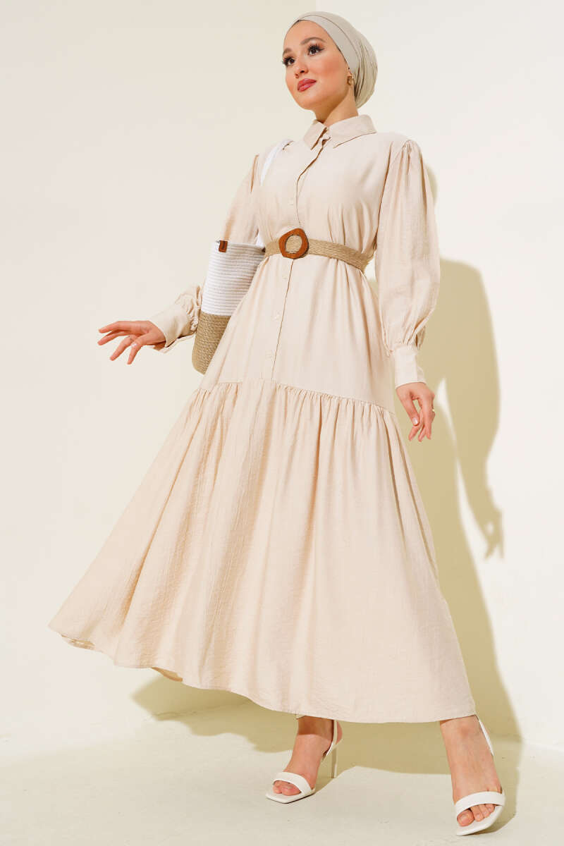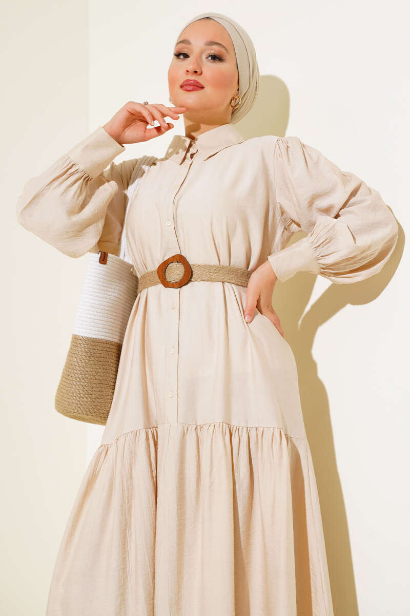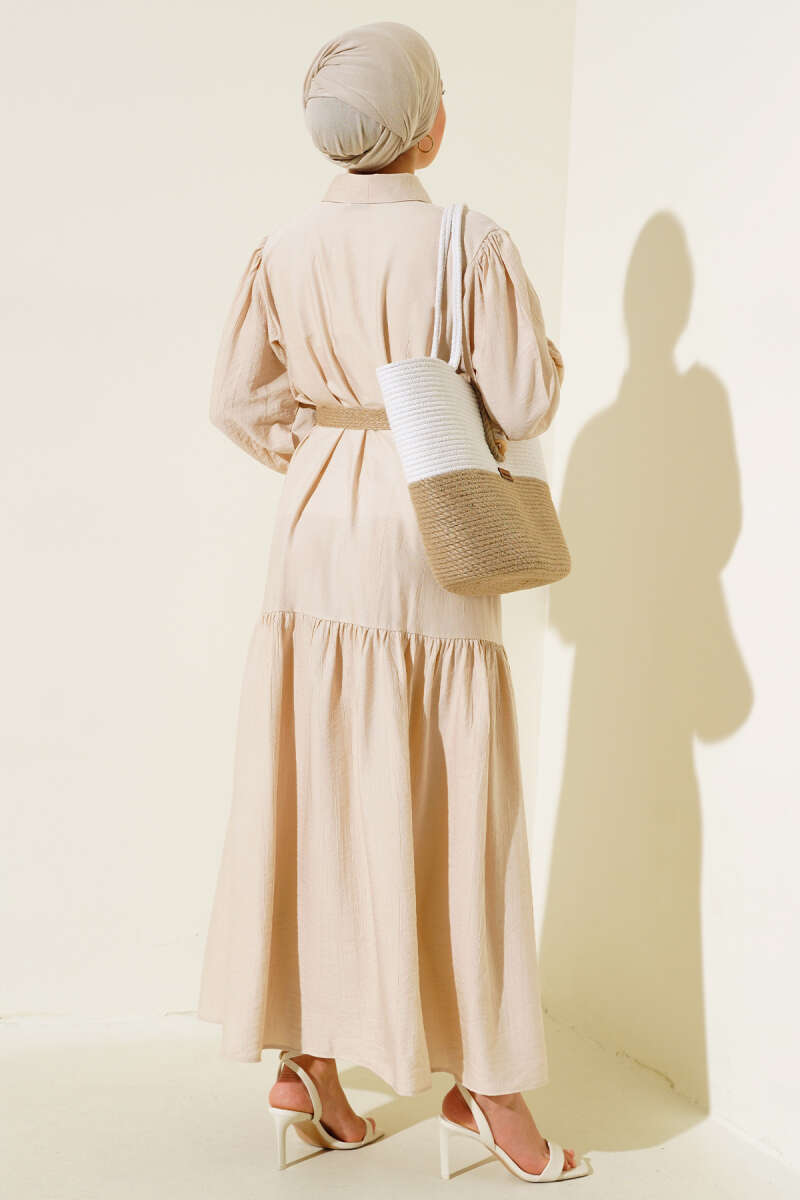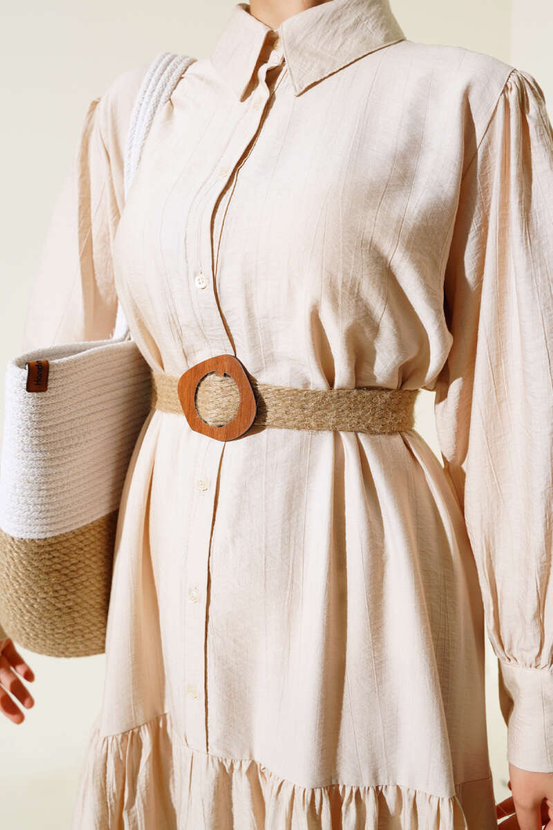 Scuba Pens Detaylı Kemerli Elbise Ekru