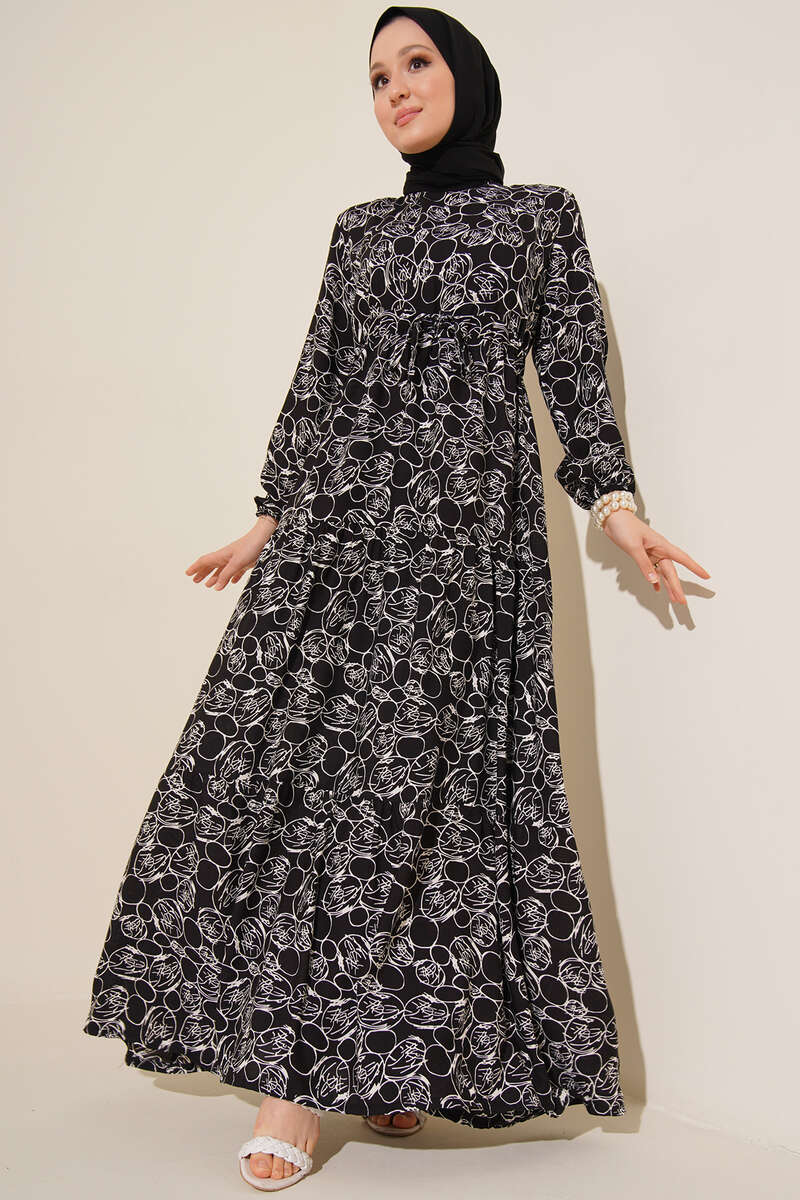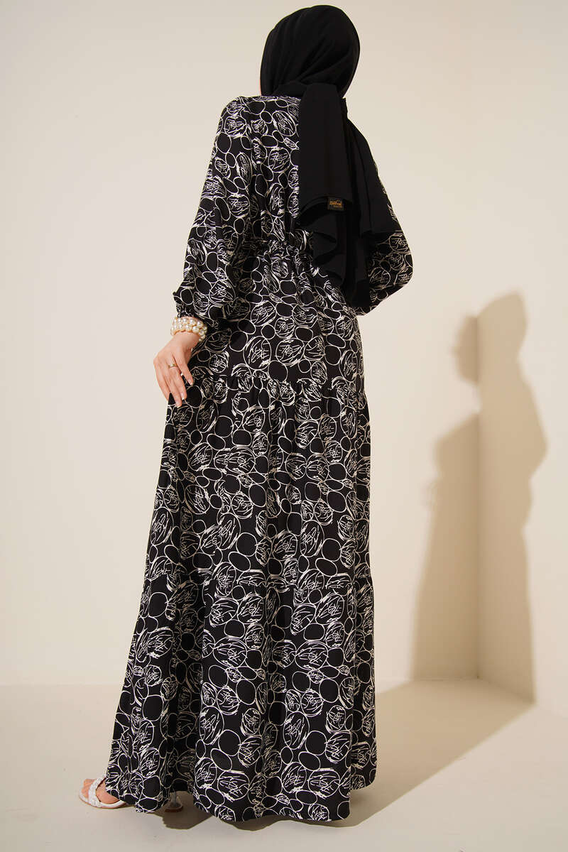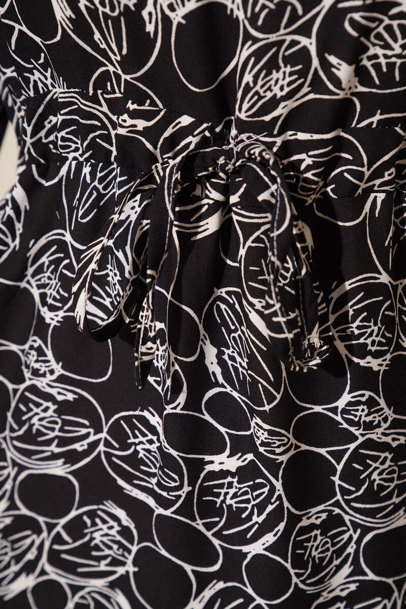 Yeni sezon elbisemiz etnik çiçek desenleriyle bu yazın en dikkat çekecek modellerindendir. Bilekleri lastikli olan elbisemizin ense düğmesi vardır. Beli tünelli ip bağlaması detayıyla hareket kazanmıştır.