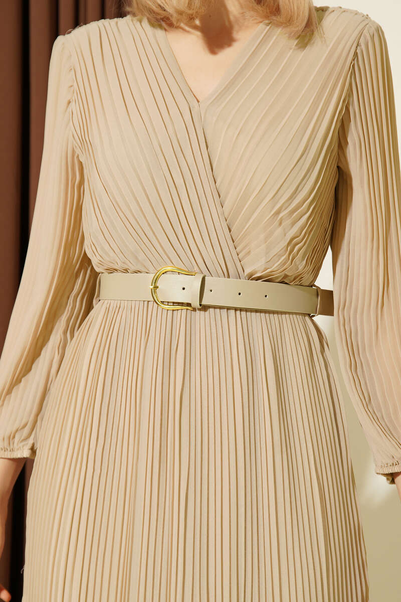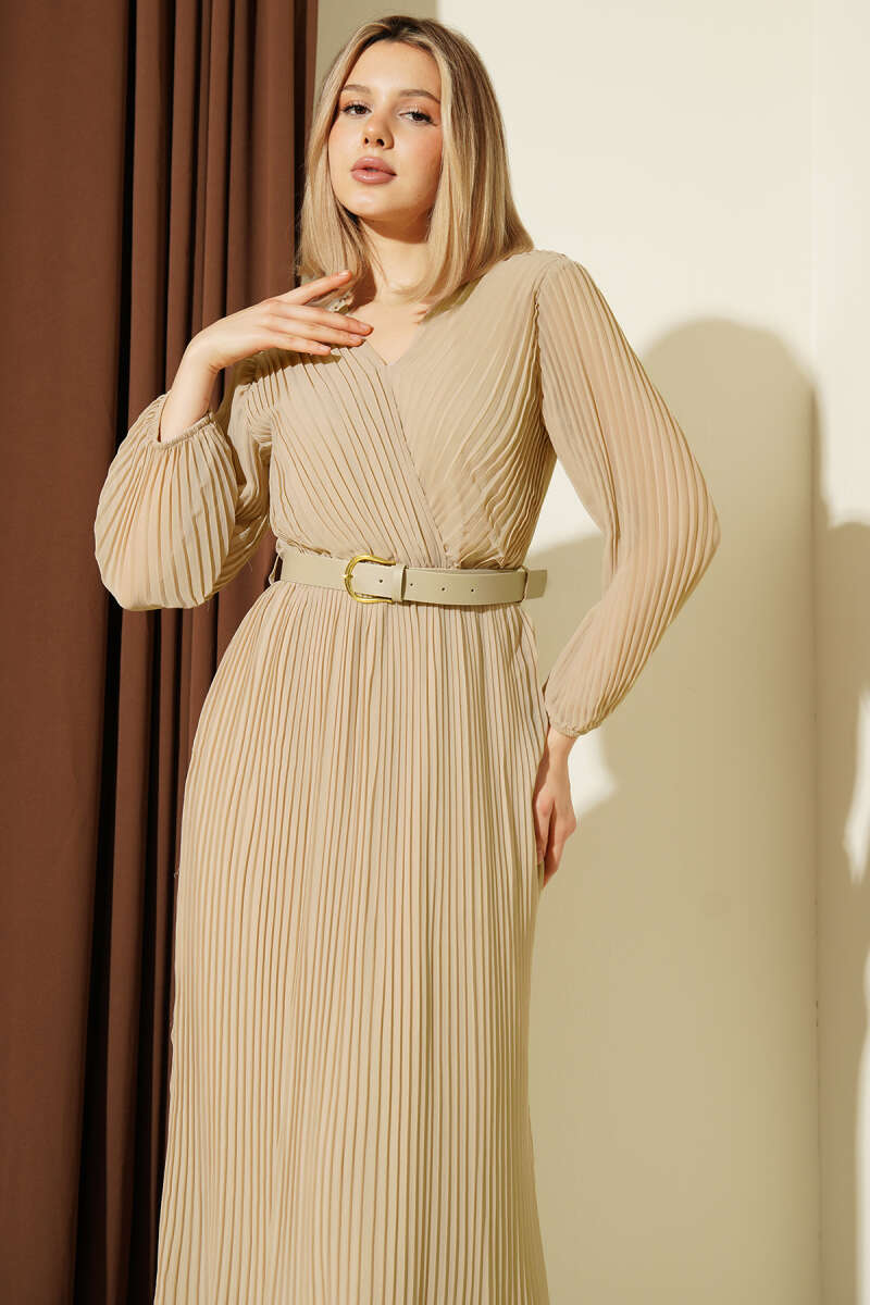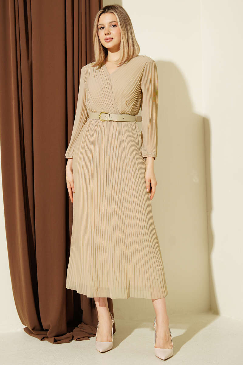 Kemerli Kruvaze Yaka Pileli Midi Elbise Bej