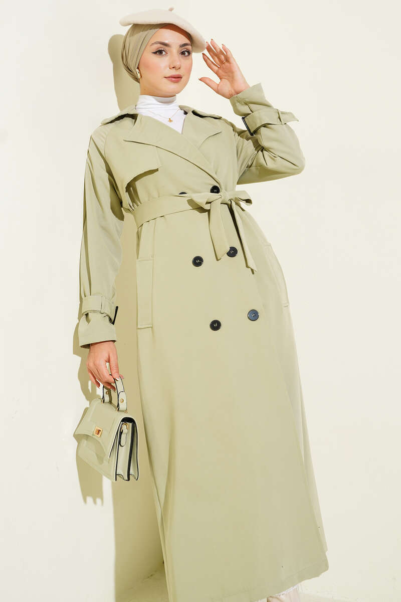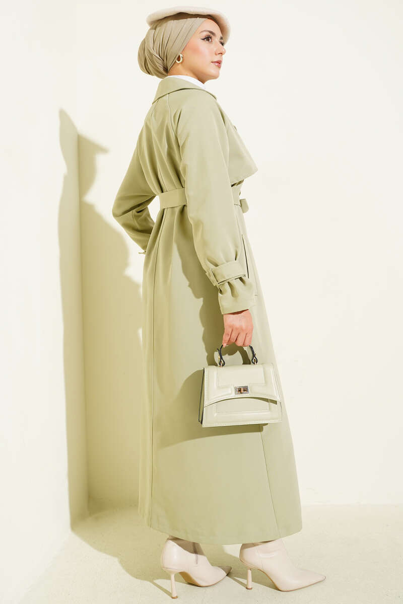 Kruvaze Yaka Bel Bağlamalı Kot Trençkot Füme