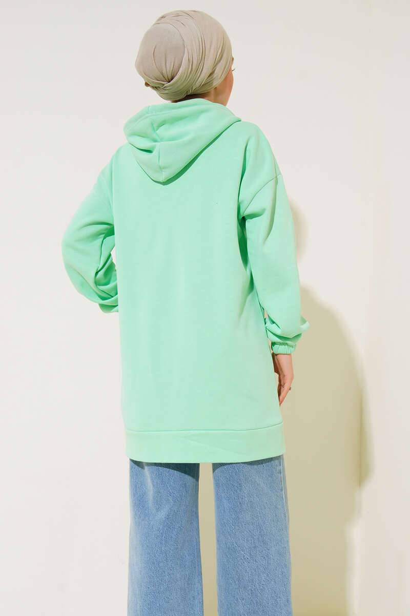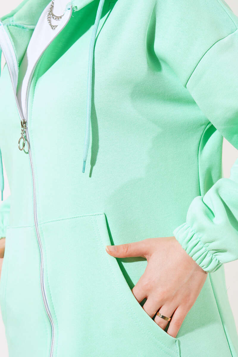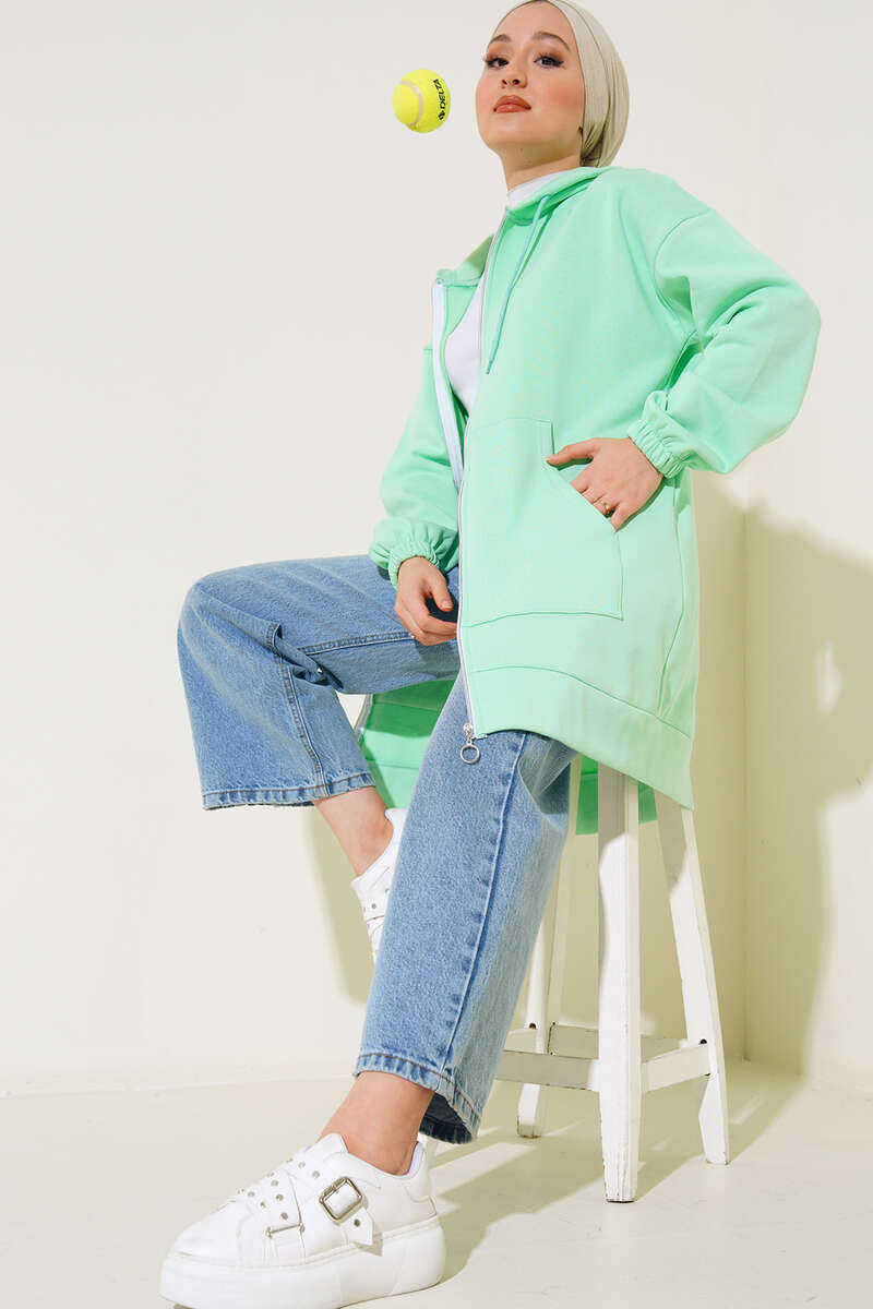 İçi şardonlu olan hırkamız kapüşonlu modeldir. Boydan fermuarlı olup kapüşonu bağcık detaylıdır. Hırkamızın iki adet geniş cepleri mevcuttur. Düşük omuzlu model hırkamızın bilekleri lastiklidir.