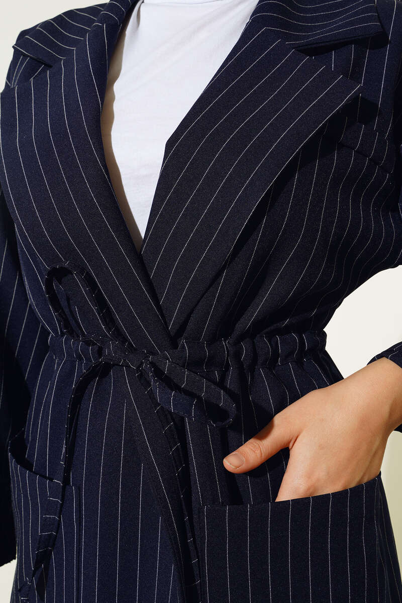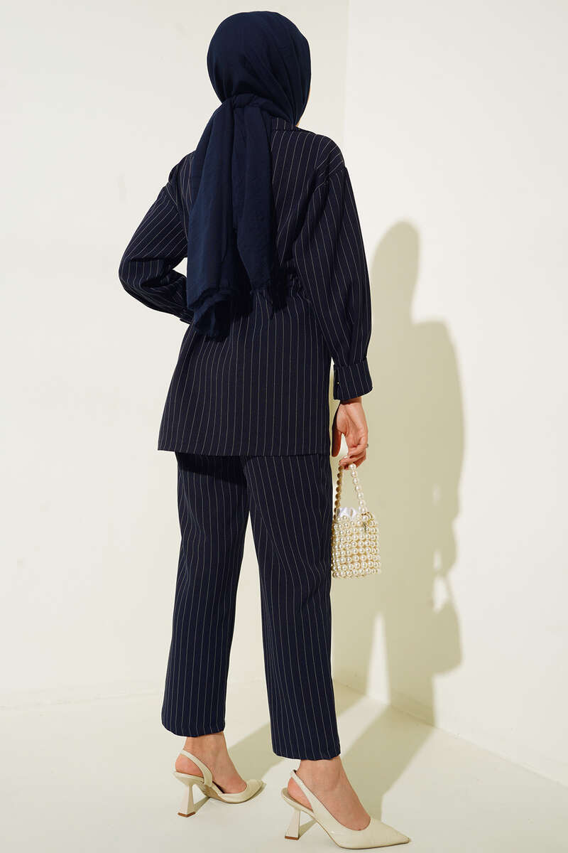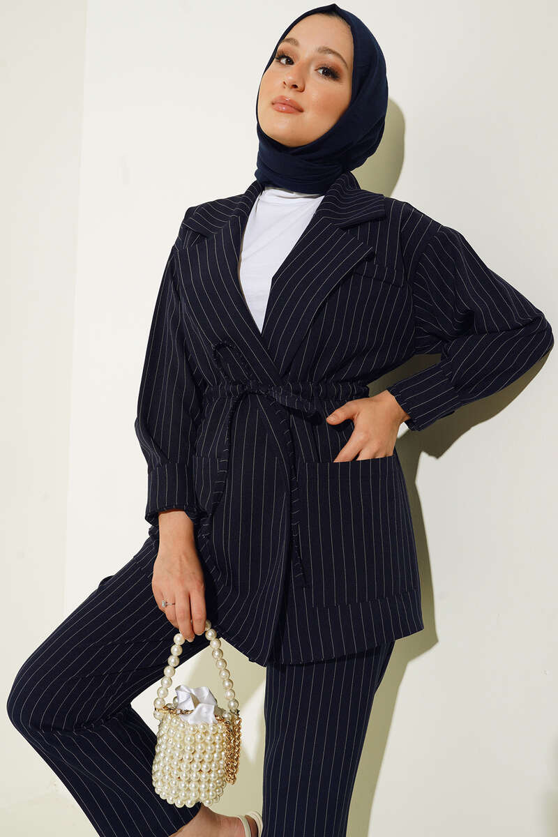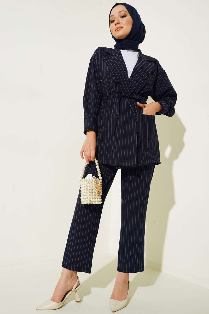 Yeni sezon ceket pantolon takımımız çizgi desenleriyle çok şık bir görünüme kavuşmuştur. Beli ip bağlamalı olan ceketimizin iki adet cebi bulunmaktadır. Pantolonumuzun cepleri mevcuttur.