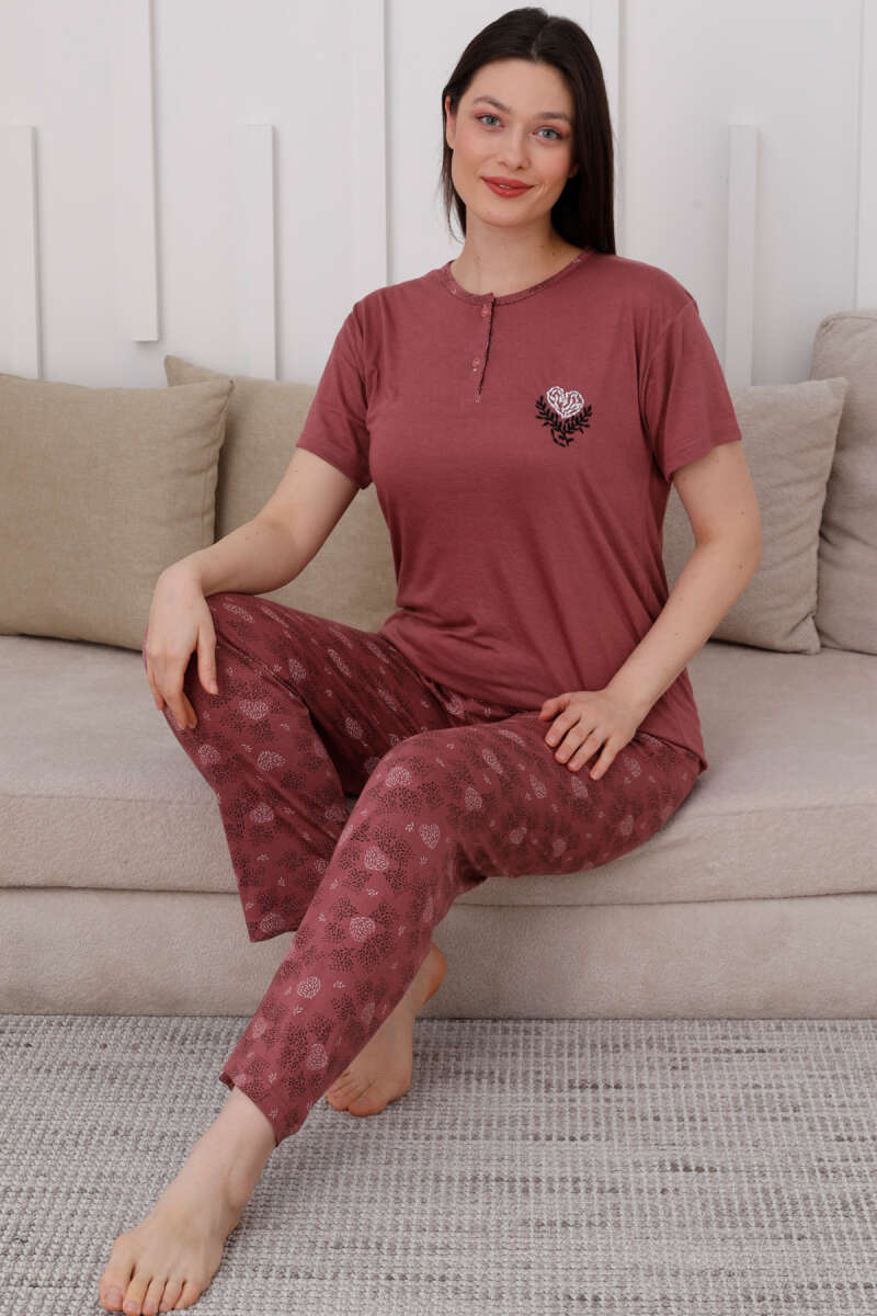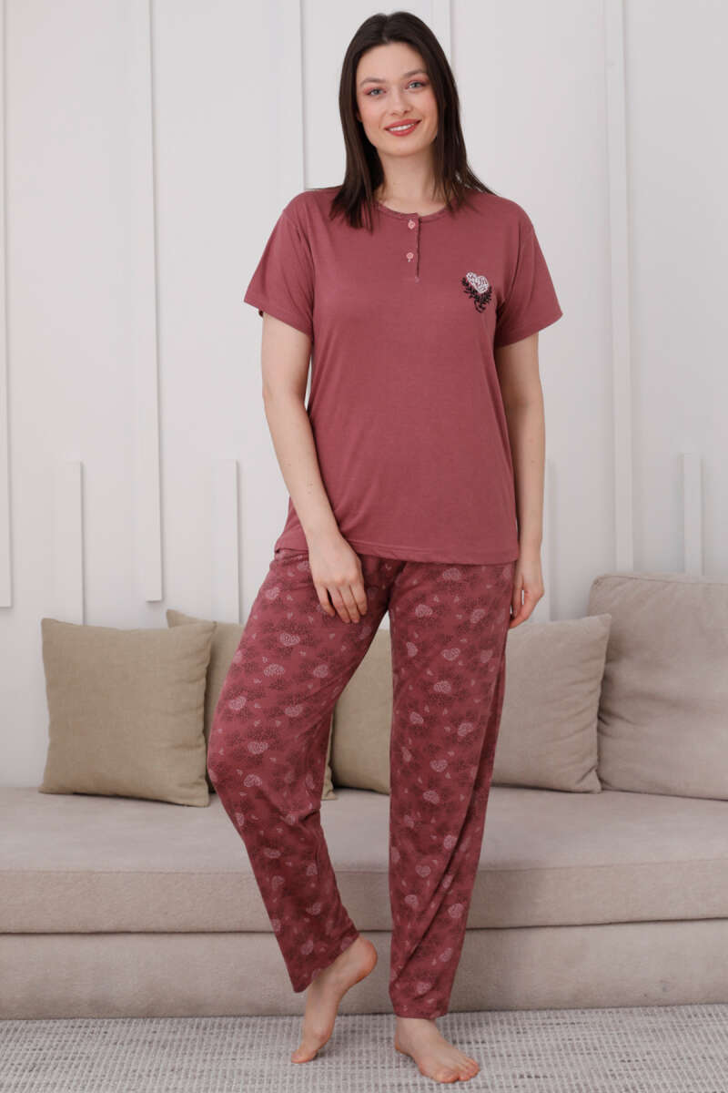 İki Düğmeli Desenli Viskon Pijama Takımı Gül Kurusu