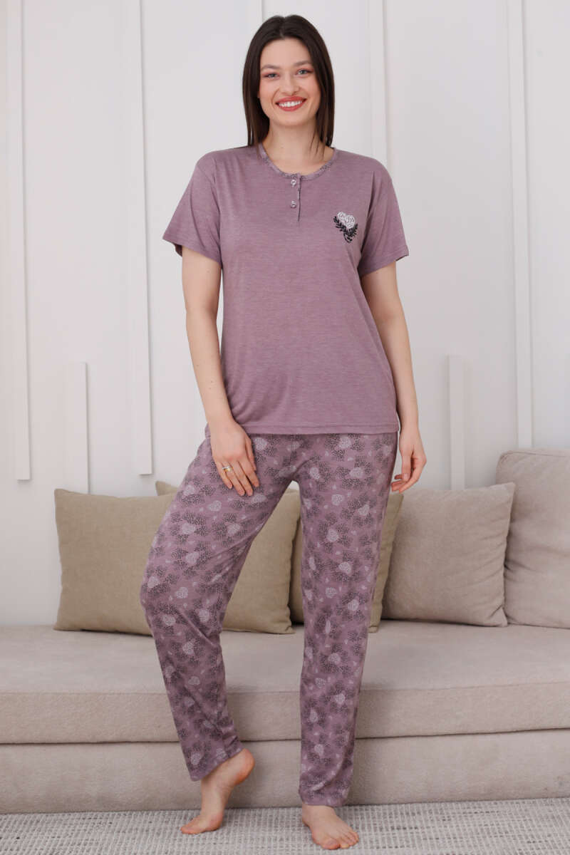 İki Düğmeli Desenli Viskon Pijama Takımı Leylak