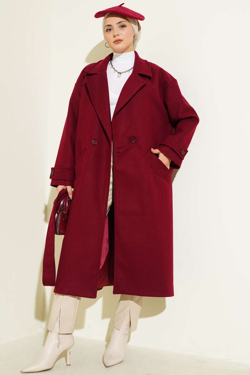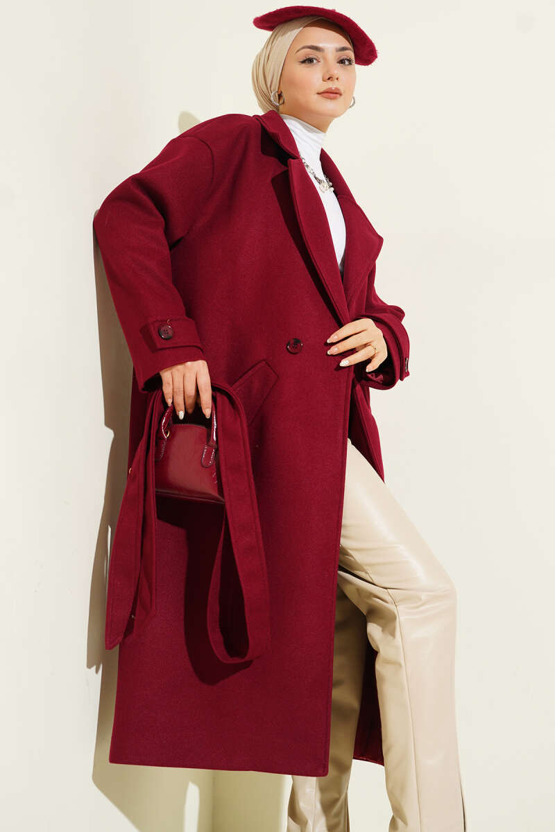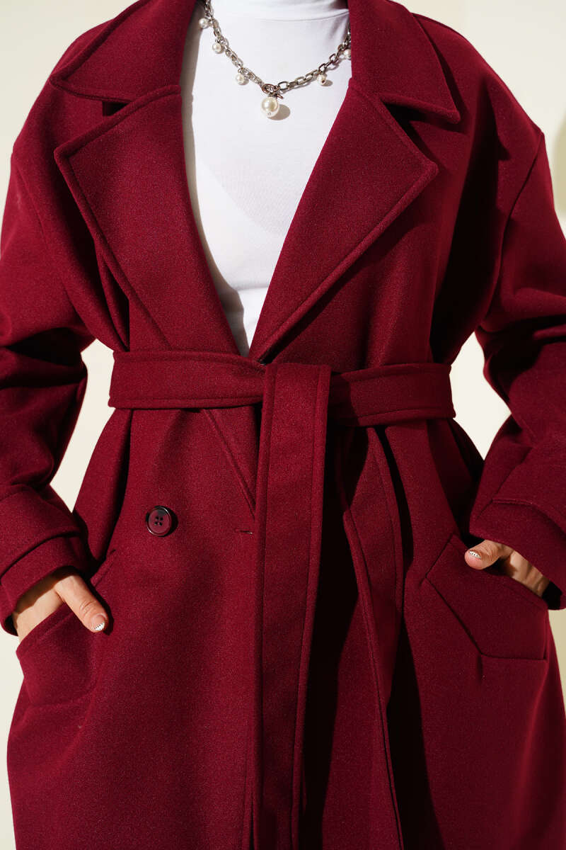 Kuşaklı Gold Düğmeli Kaşe Kaban Kırmızı