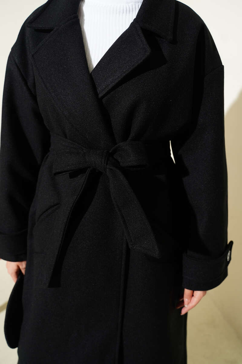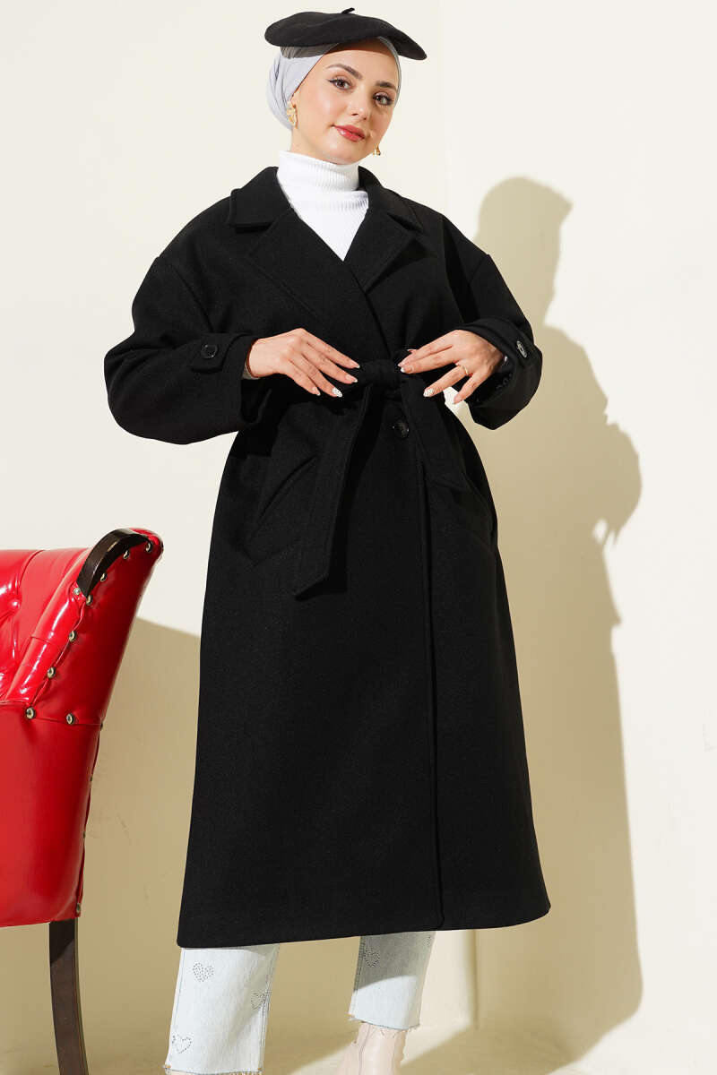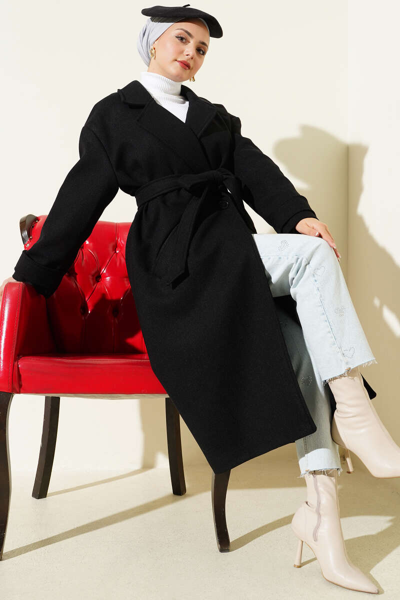 Kruvaze Yaka Omuz Apoletli Kaşe Kaban Siyah
