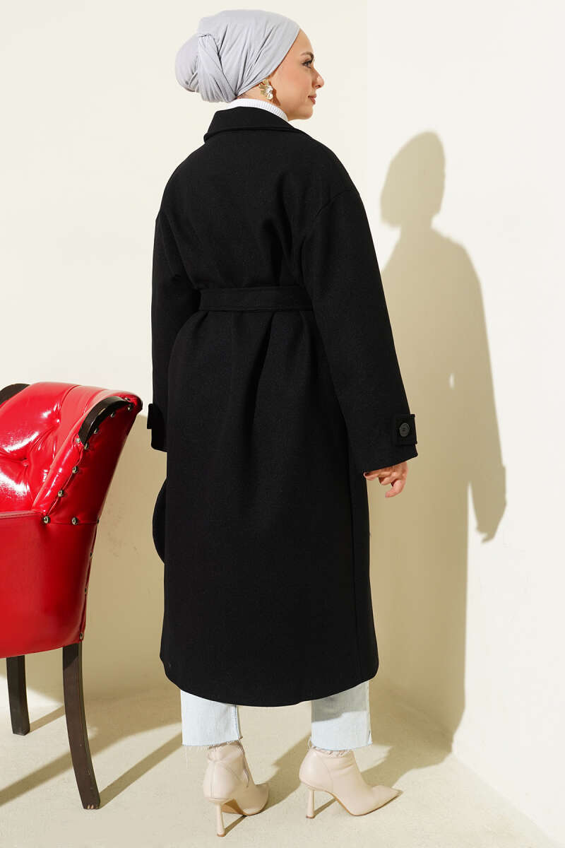 Kol Düğme Detaylı Kruvaze Kaban Siyah
