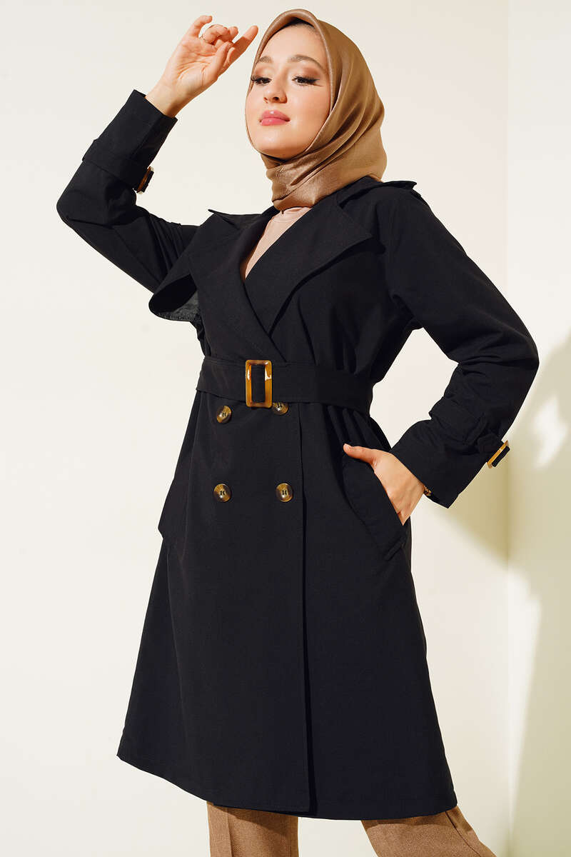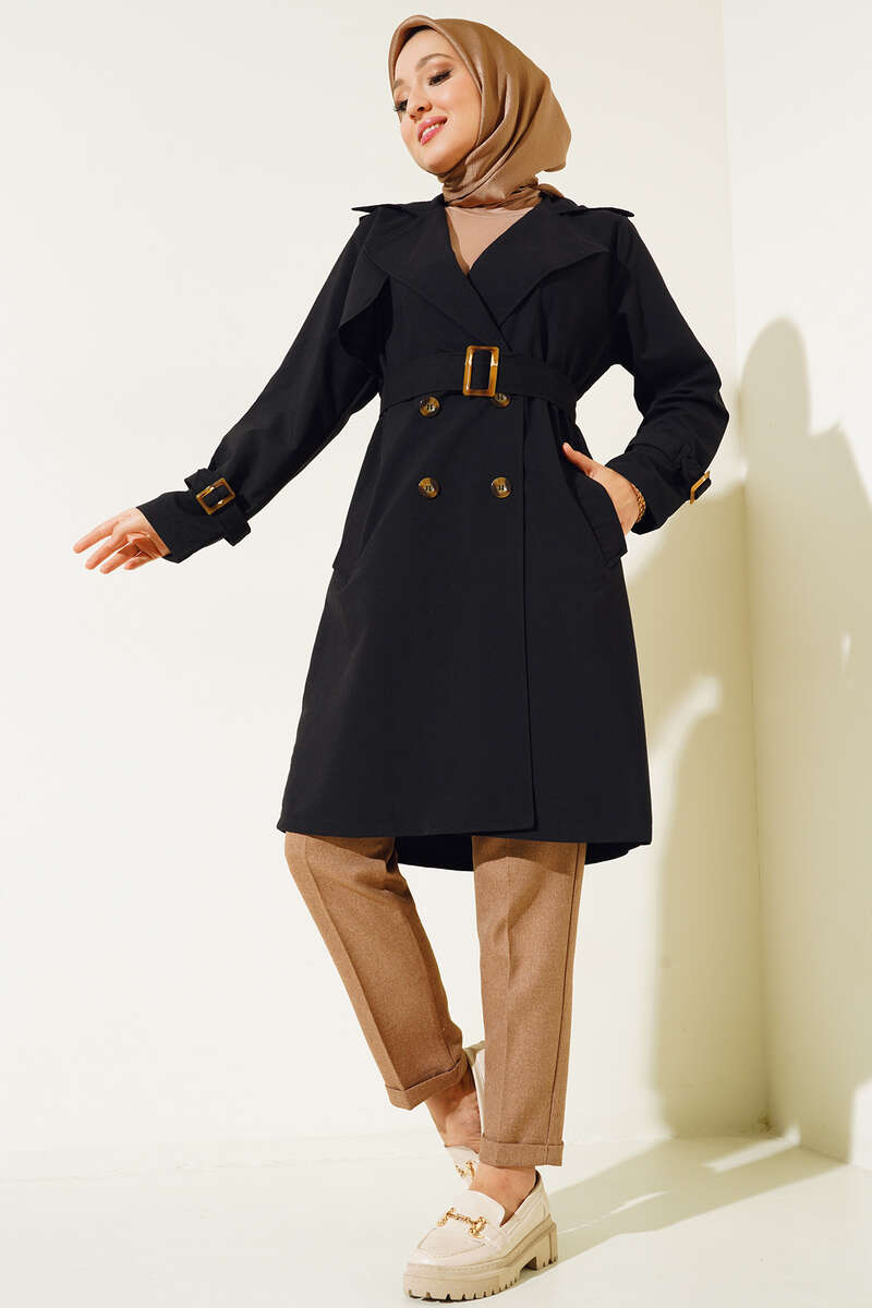Yeni sezon trençkotumuz iki düğmelidir. İçi astarsız trençkot bel kuşaklıdır. Kuşağı kemer tokalıdır. İki adet kemer köprüsü ve cebi bulunmaktadır. Omuz apoletlidir.