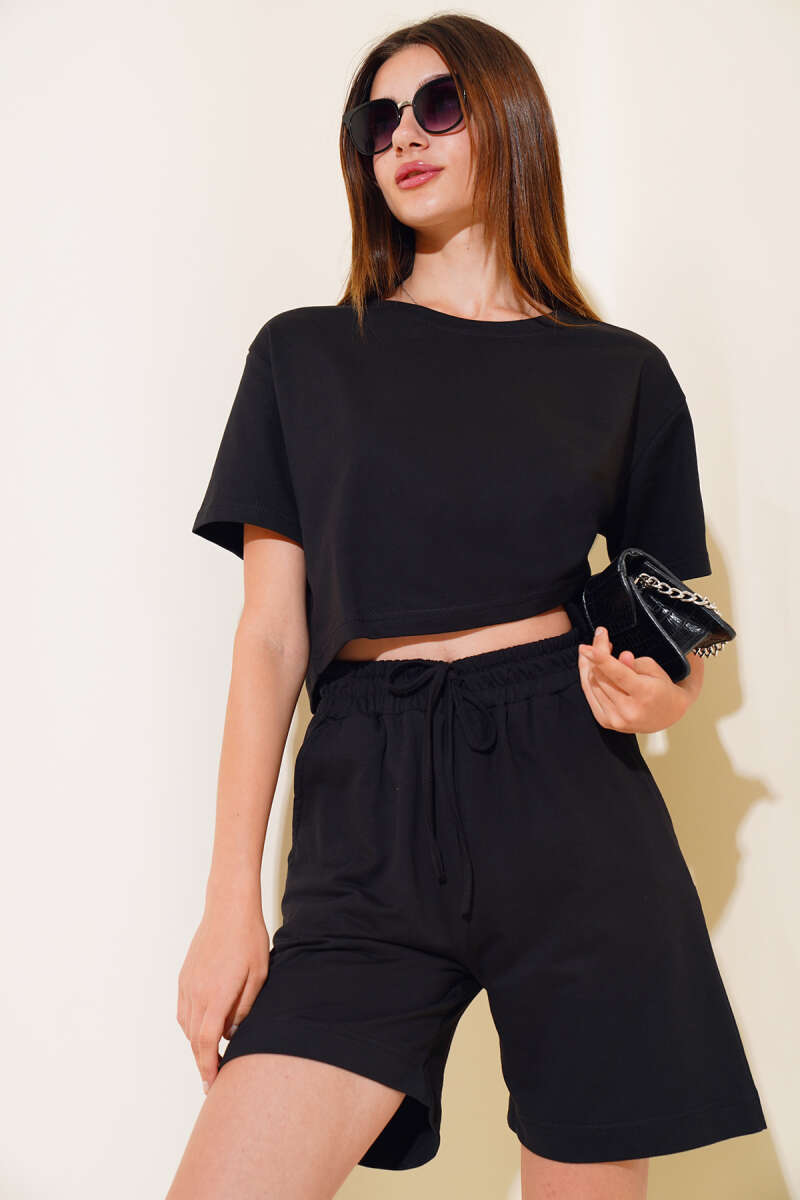 Yarım Fermuarlı Crop İkili Takım Siyah