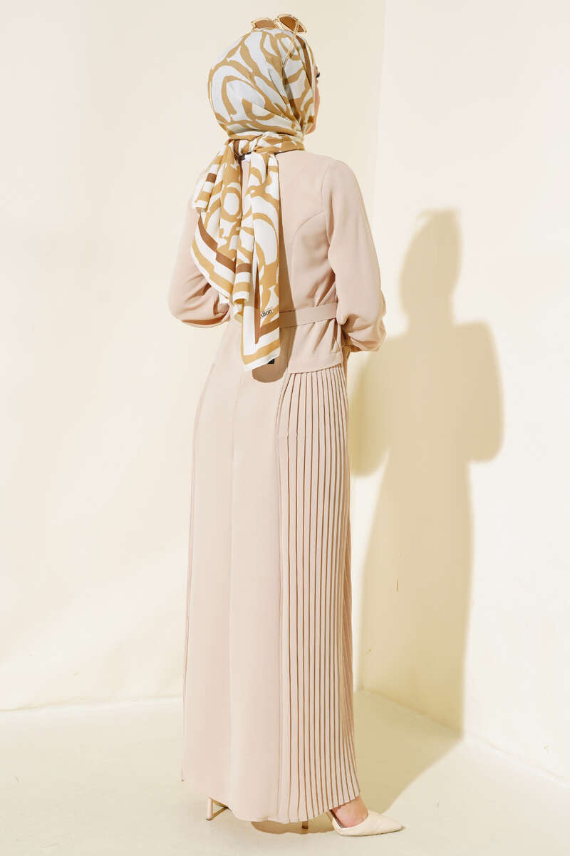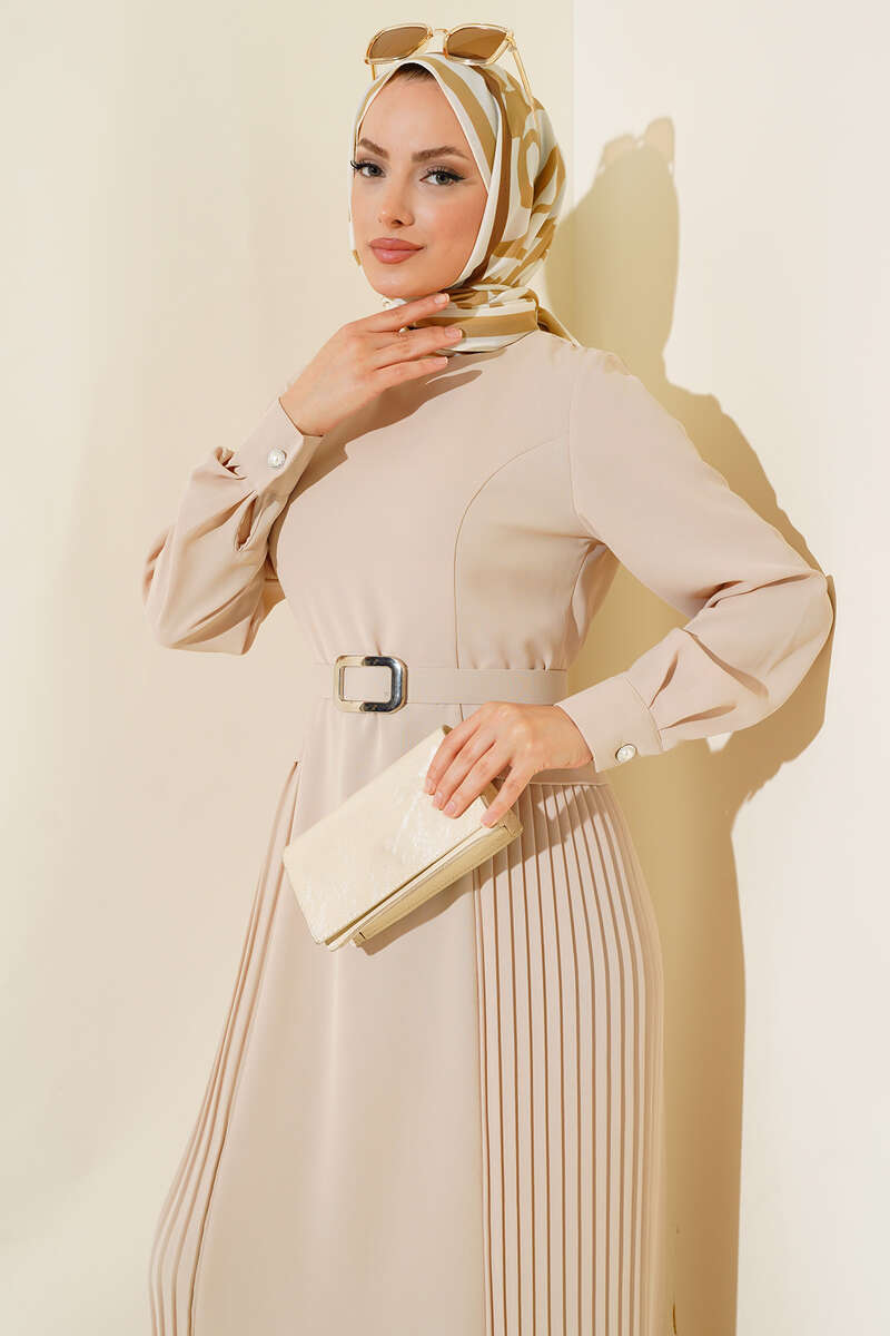İki Yanı Piliseli Elbise Bej