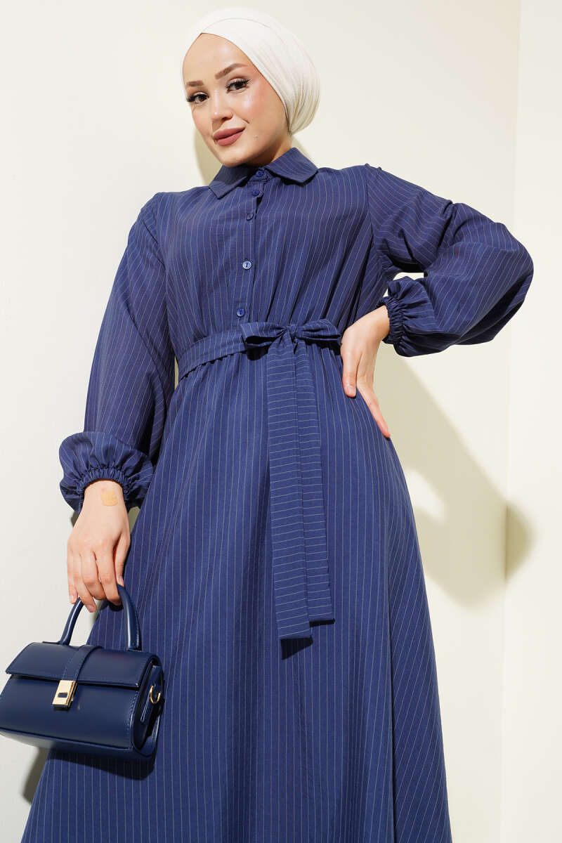 Bilek Bağlamalı Kuşaklı Abiye Elbise Lacivert