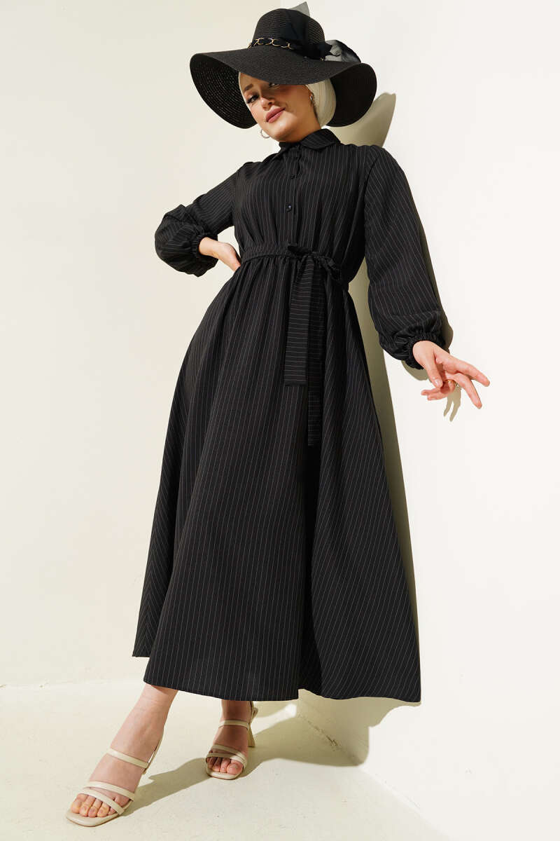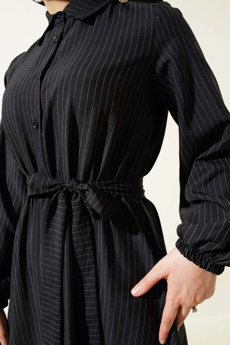 Yatay Çizgili İp Bağcıklı Triko Elbise Siyah