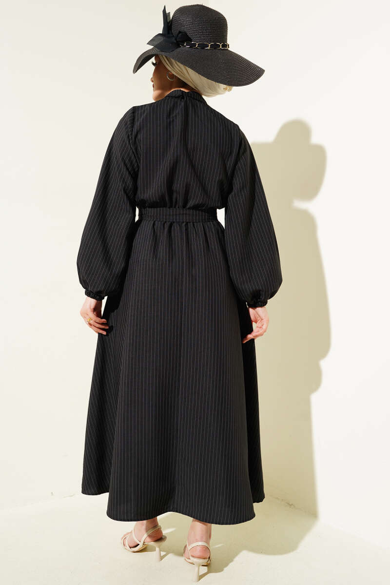 Kolları Zebra Desen Kuşaklı Siyah Elbise