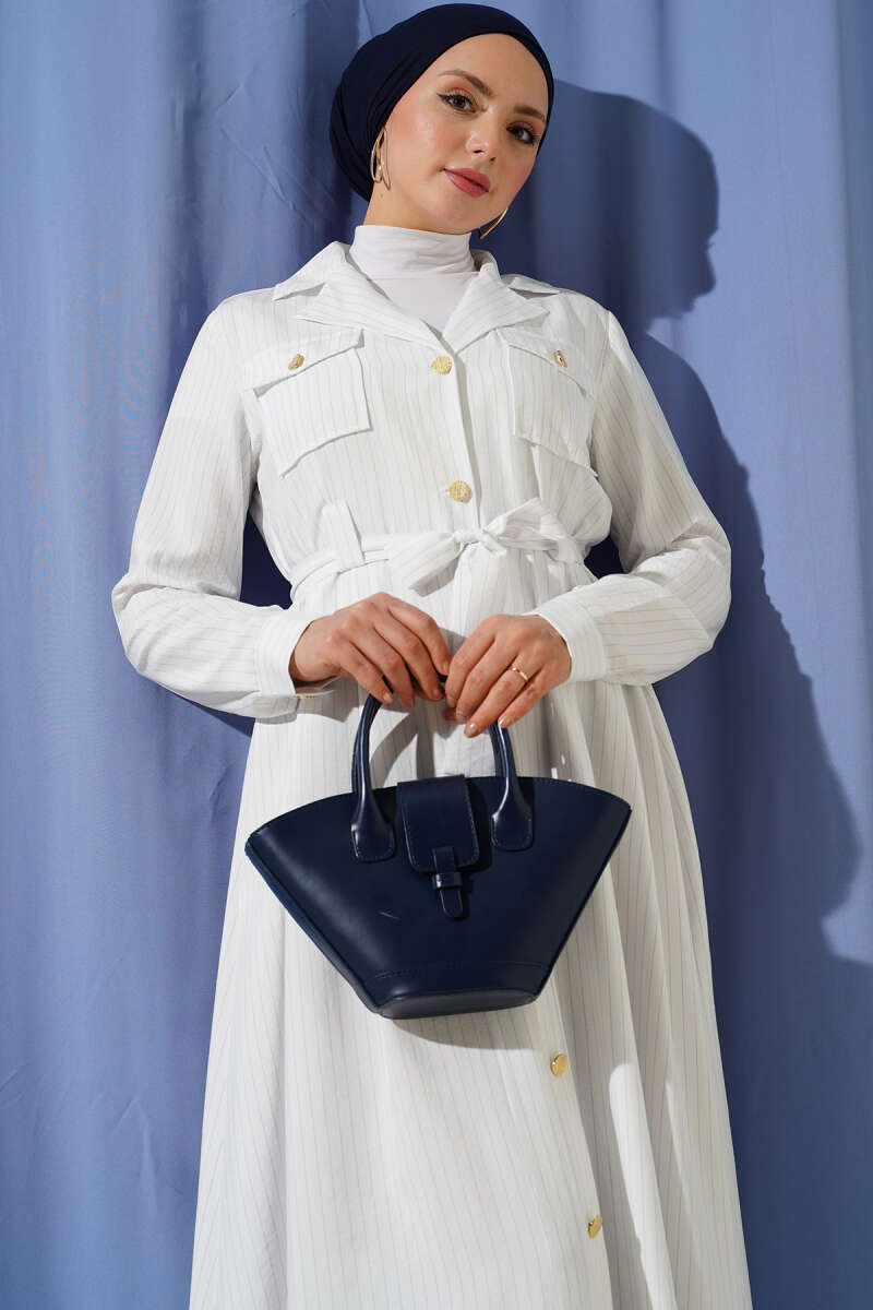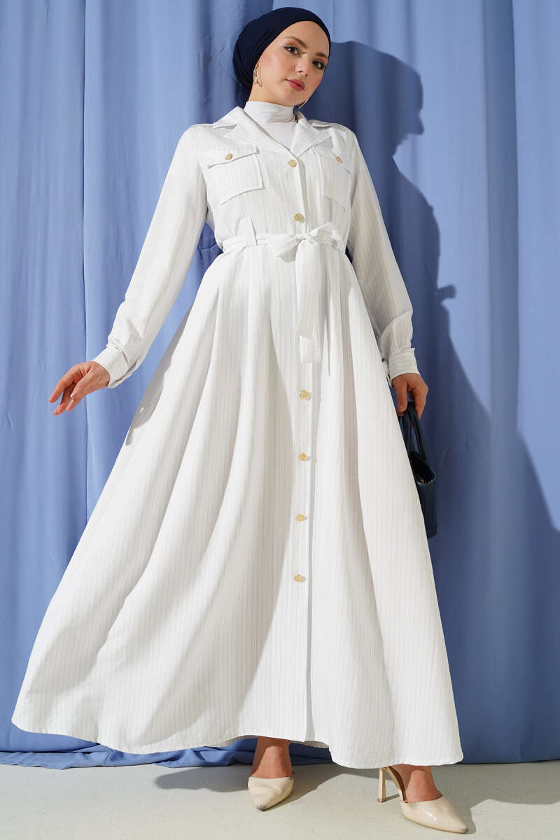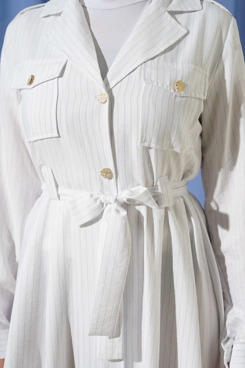 İnce Çizgili Boydan Düğmeli Elbise Beyaz