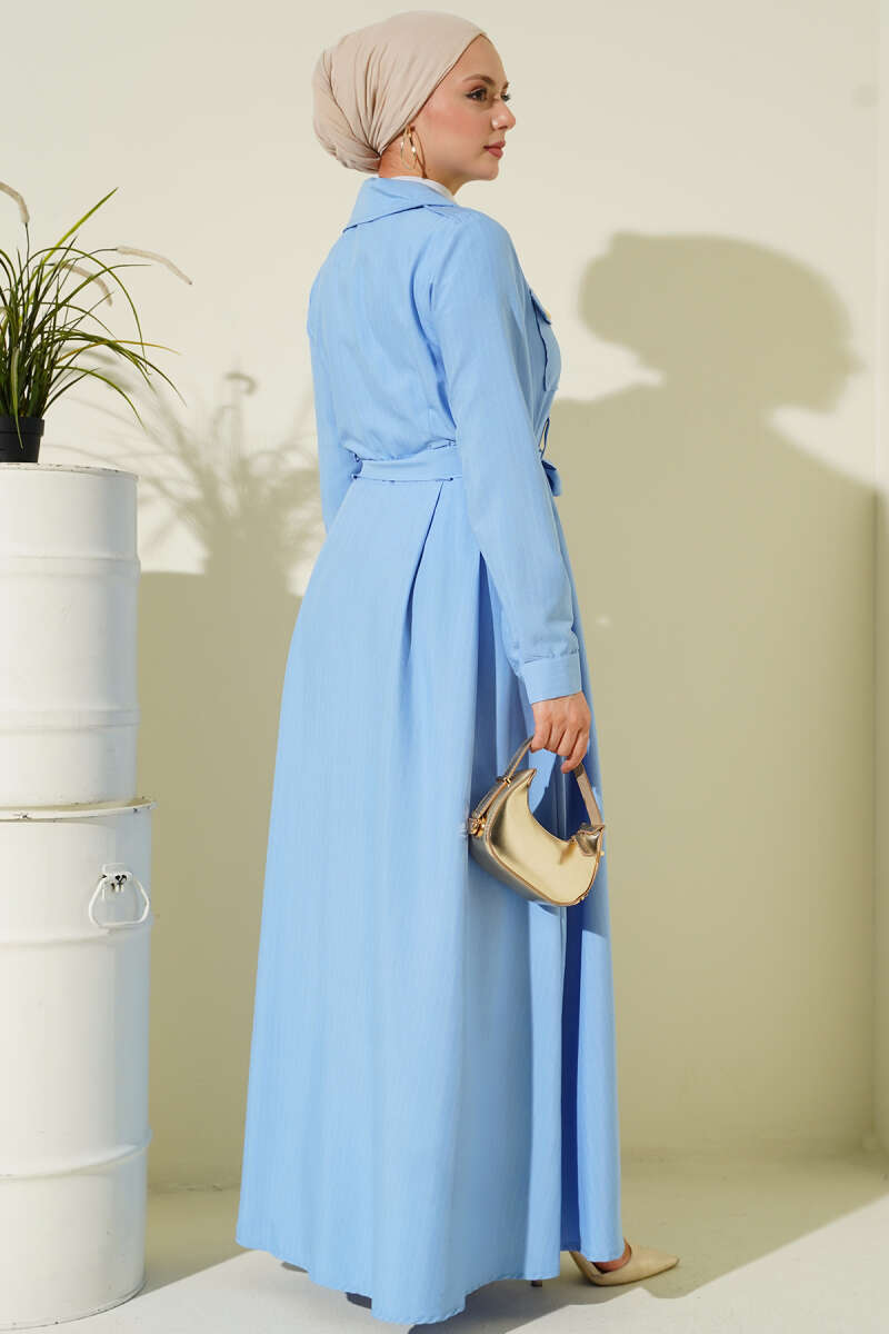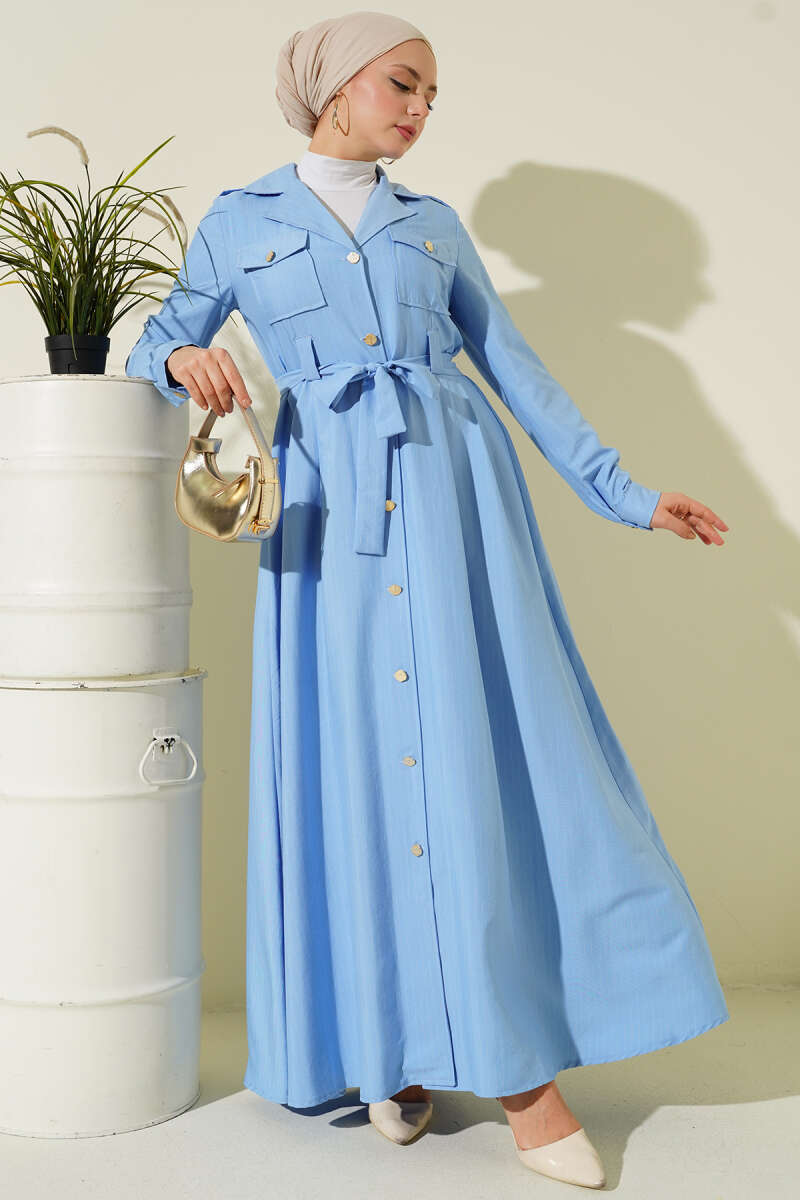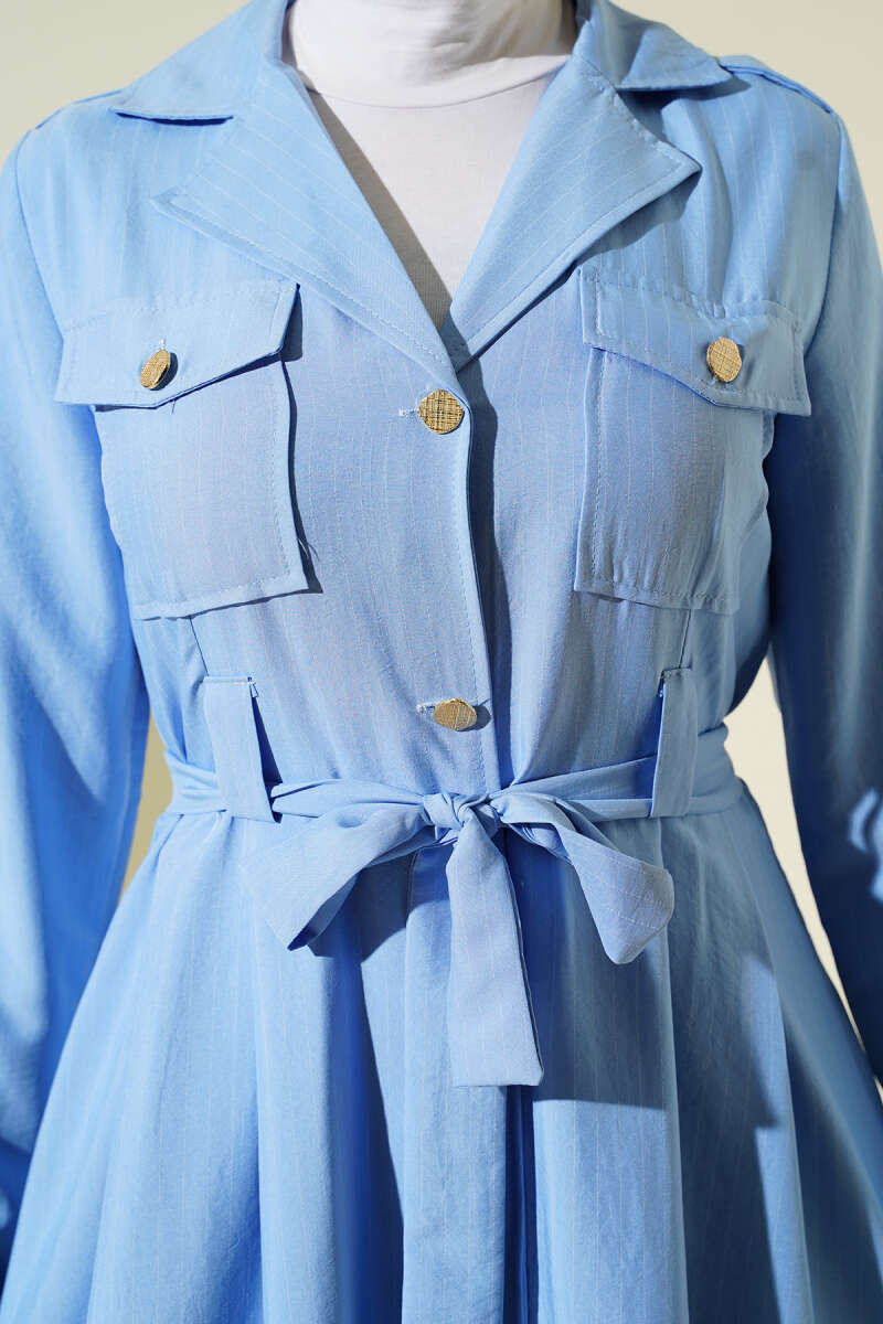 İnce Çizgili Boydan Düğmeli Elbise Mavi
