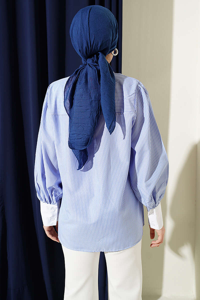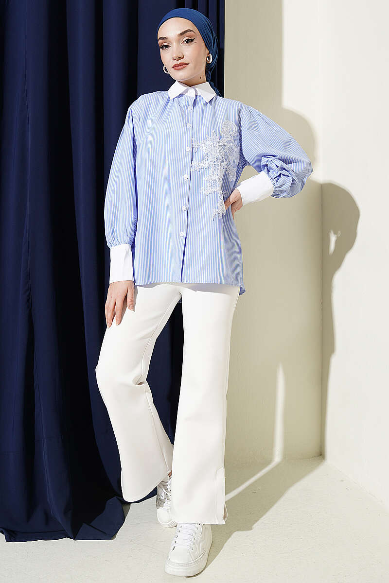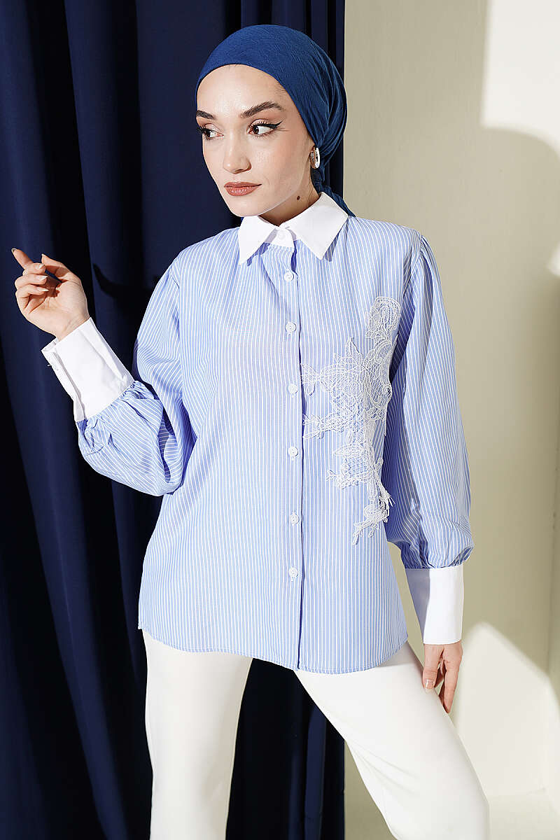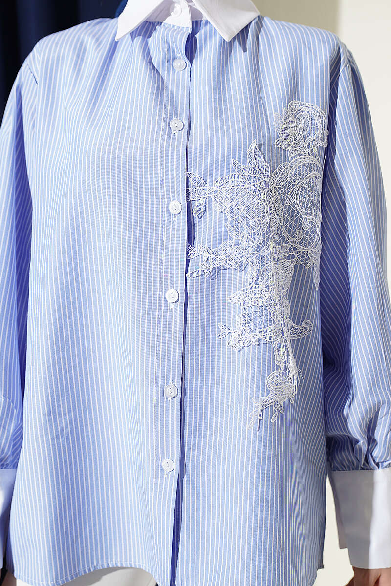 İnce Çizgili Güpür Detaylı Gömlek Mavi
