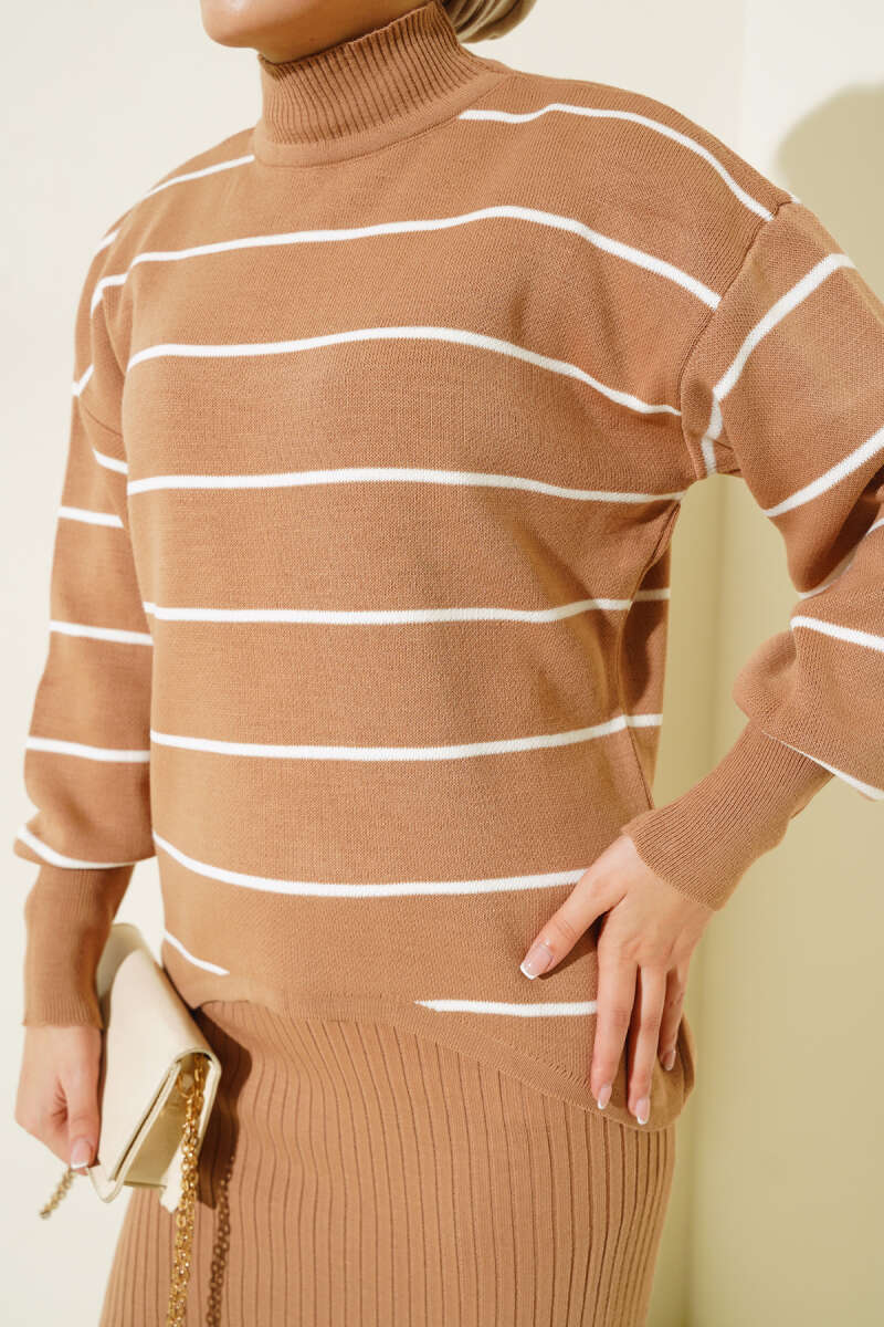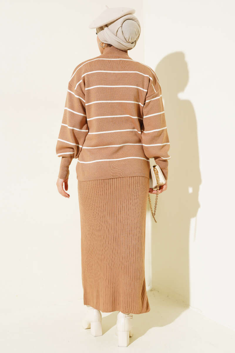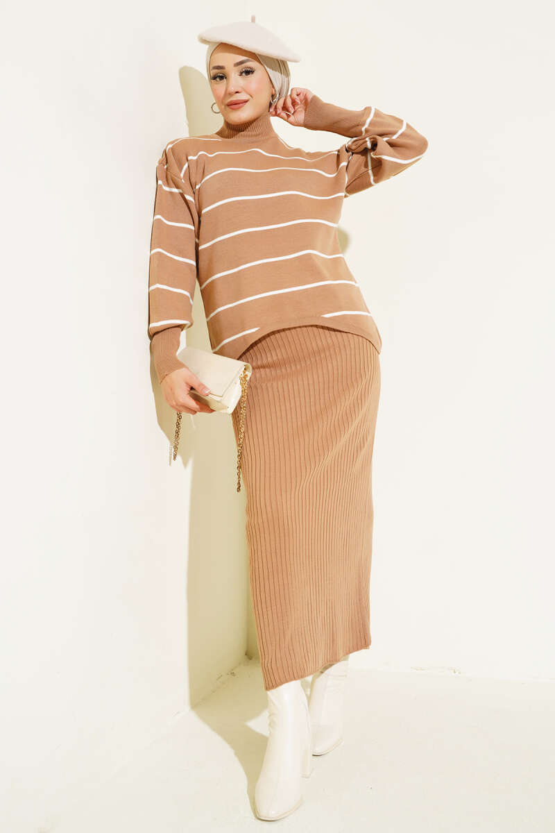 İnce Çizgili Jile Elbise Triko Takım Büsküvi