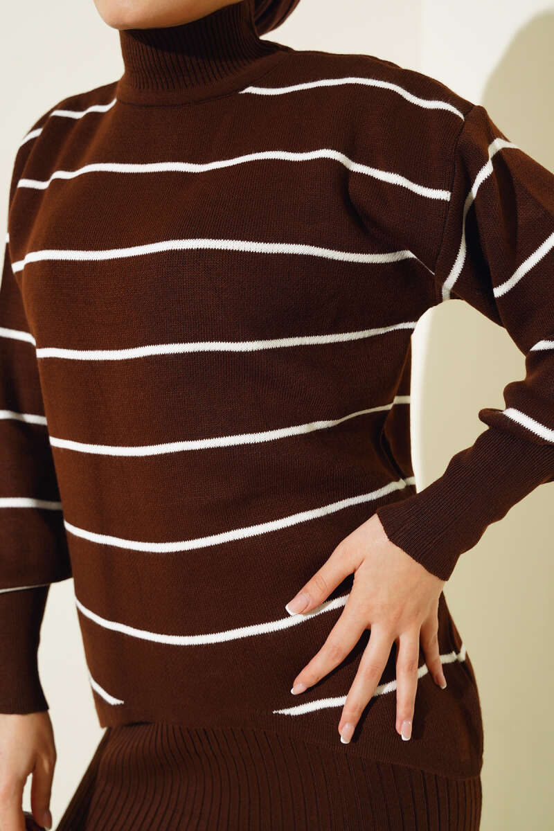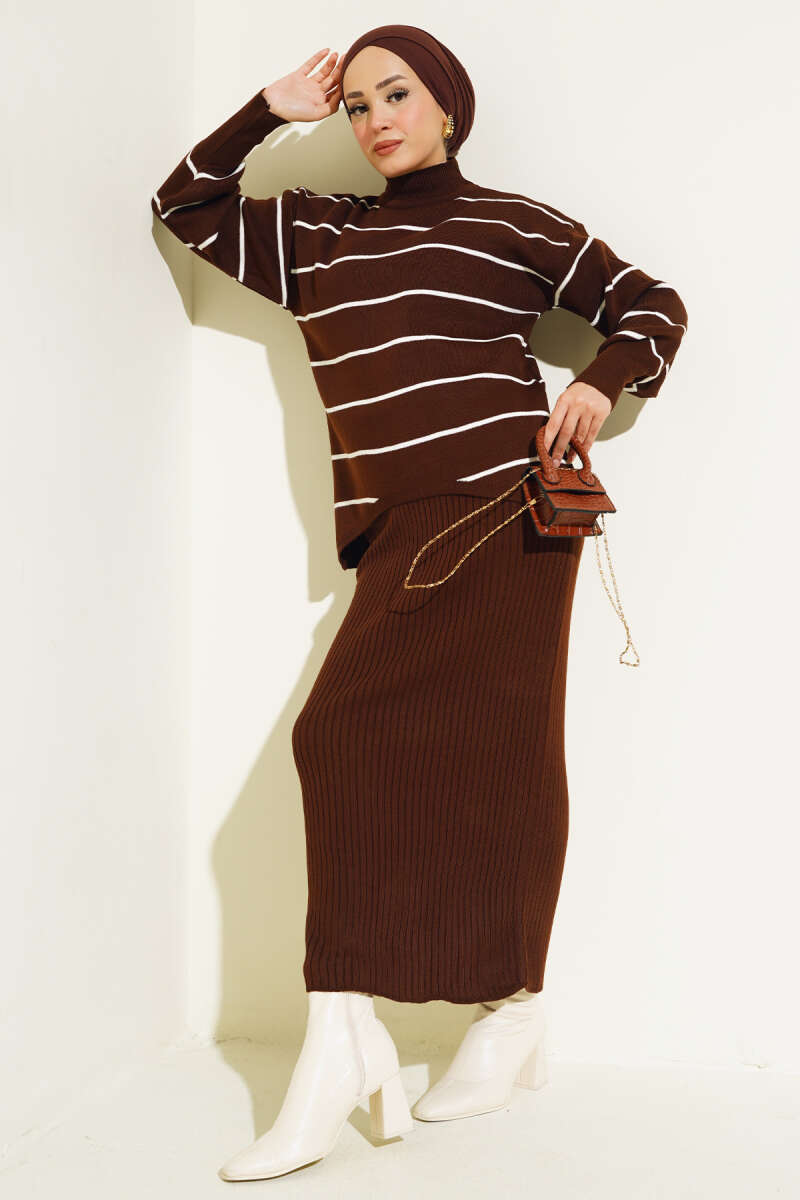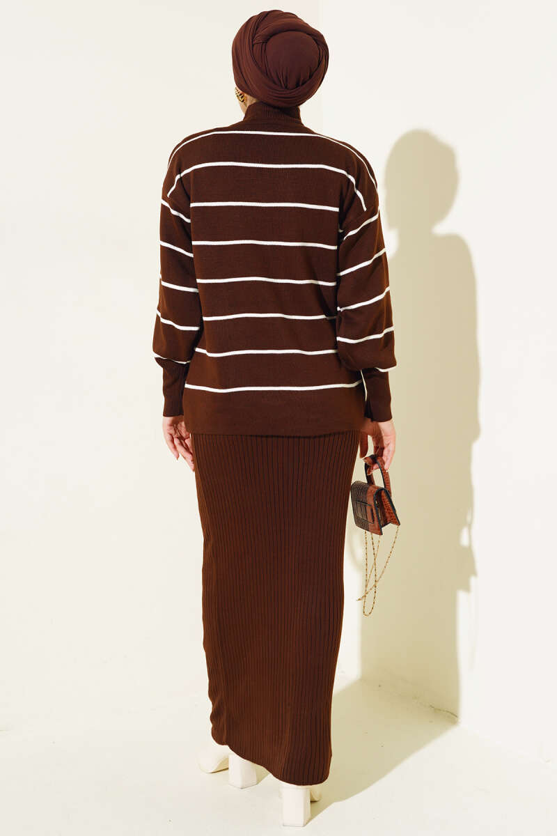 İnce Çizgili Jile Elbise Triko Takım Kahve