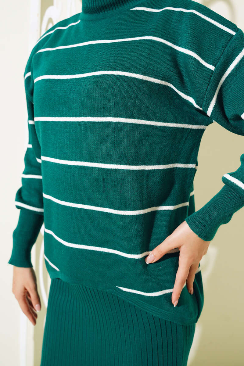 İnce Çizgili Jile Elbise Triko Takım Nefti