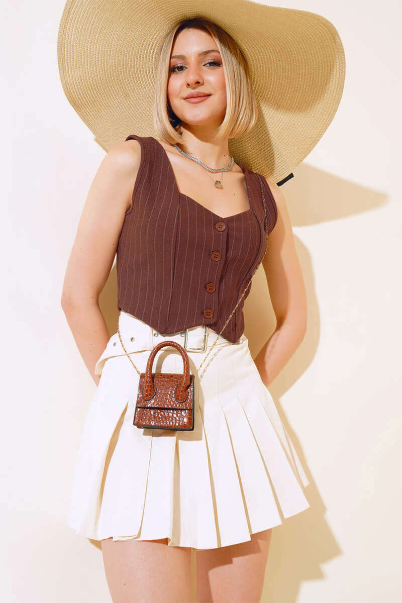 Yeni sezon kısa yelek modelimiz ince çizgilidir. Önü dört düğmeli olan yeleğimiz kombinlerinizde tamamlayıcı parça olarak görev üstlenmiştir. Dolabınızıda muhakka olması gereken yeleğimizin diğer renkleri de mevcuttur.