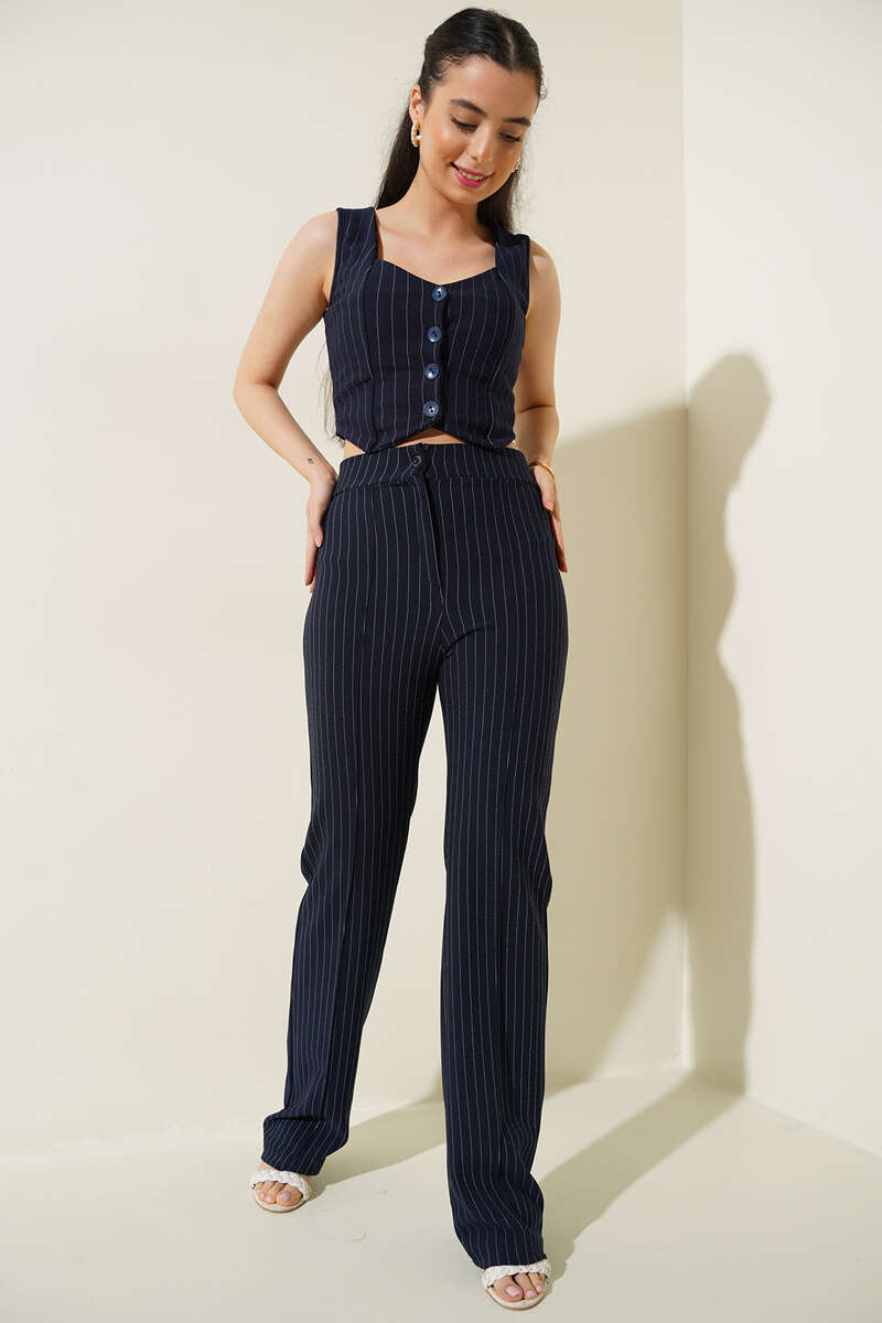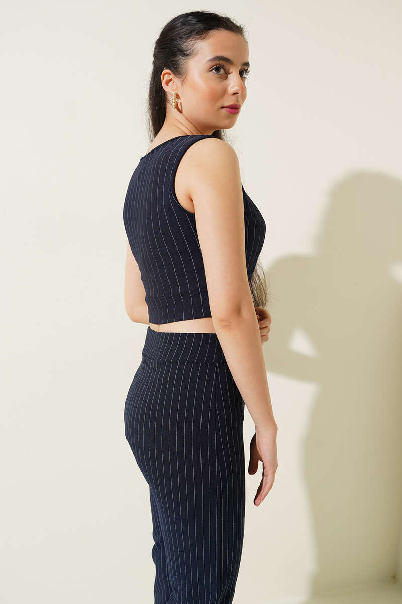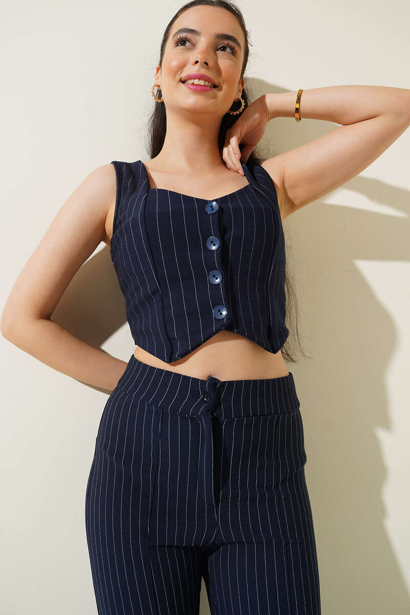 Yeni sezon kısa yelek modelimiz ince çizgilidir. Önü dört düğmeli olan yeleğimiz kombinlerinizde tamamlayıcı parça olarak görev üstlenmiştir. Dolabınızıda muhakka olması gereken yeleğimizin diğer renkleri de mevcuttur.
