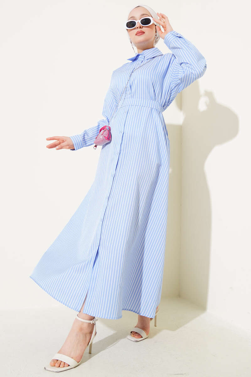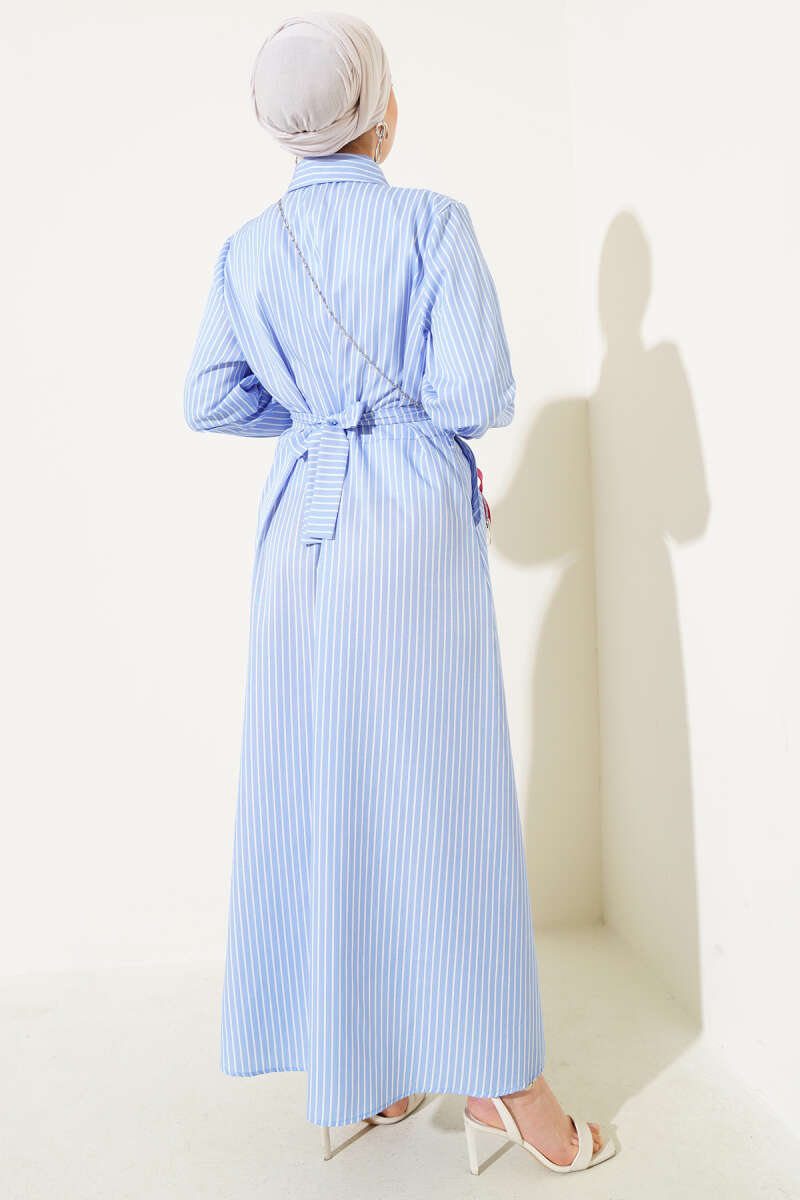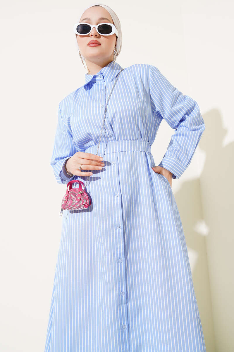 İnce Çizgili Kuşaklı Düğmeli Elbise Mavi