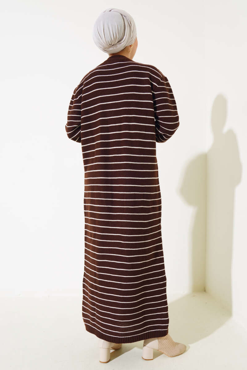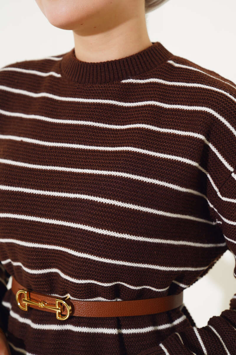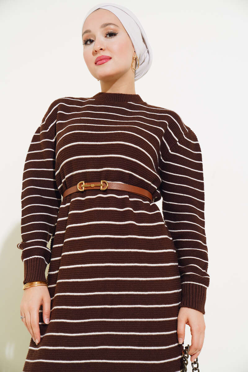 Şerit Ajur Desen Triko Elbise Acı Kahve