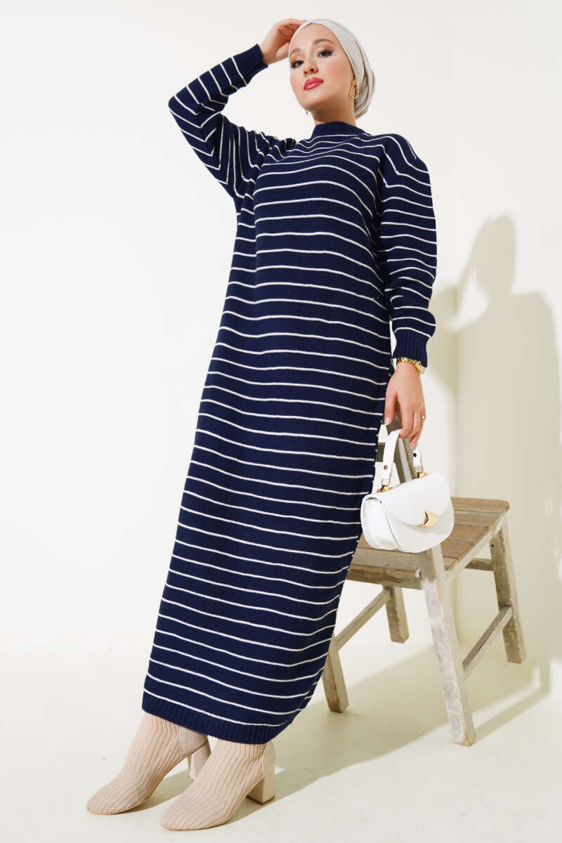 Şerit Ajur Desen Triko Elbise Zümrüt Yeşili