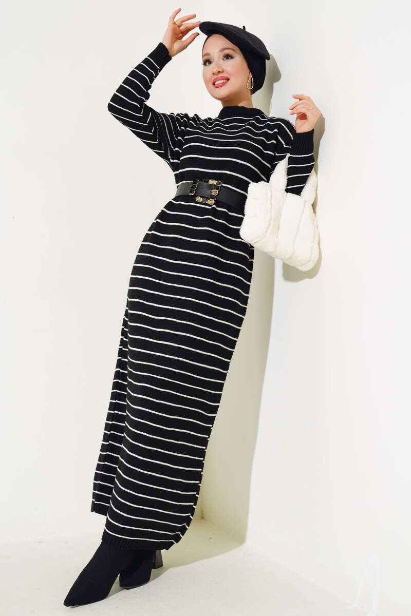 Şerit Ajur Desen Triko Elbise Zümrüt Yeşili