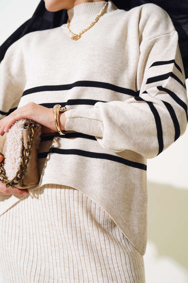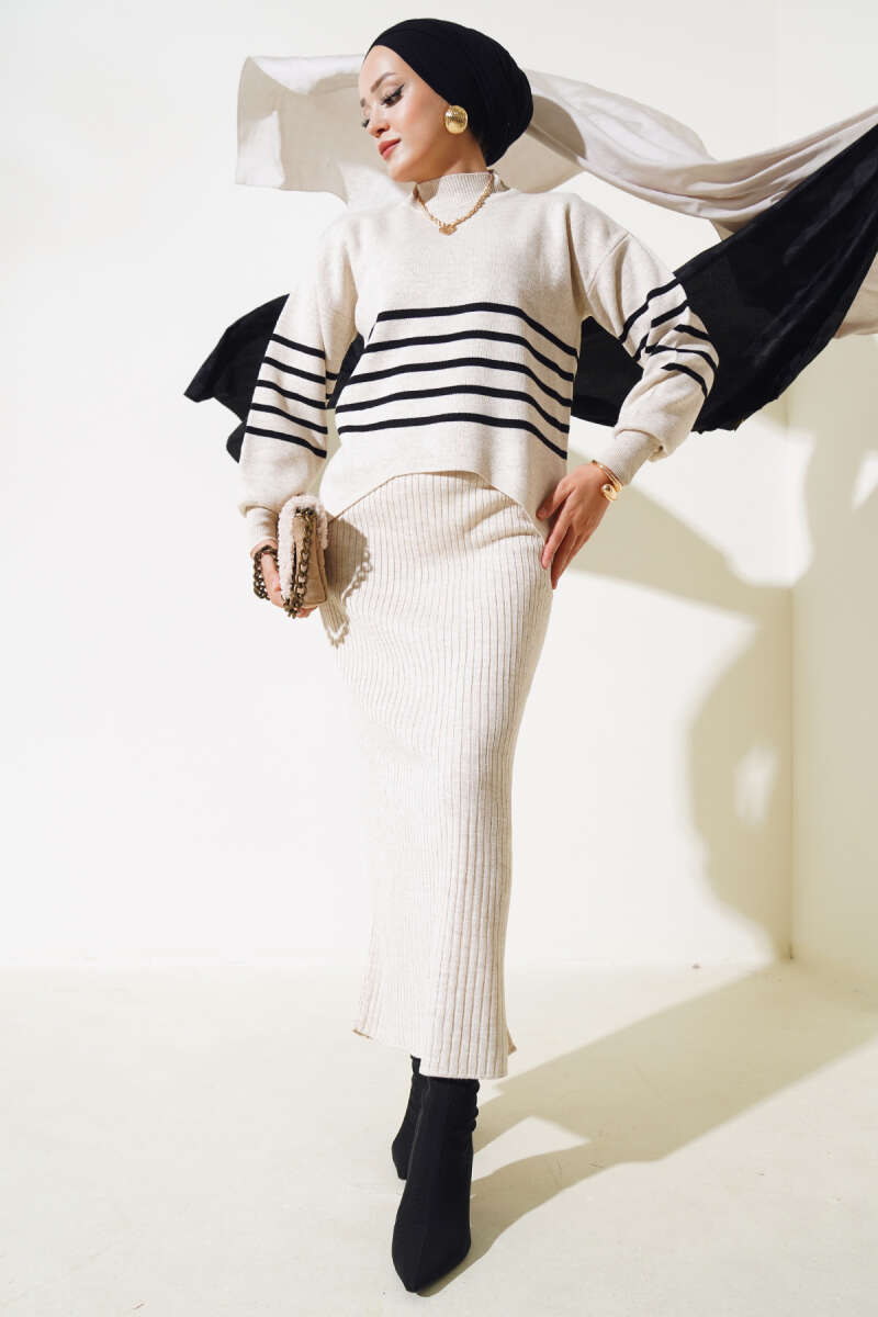 Balıkçı Yaka Fitilli Triko İkili Takım Ekru