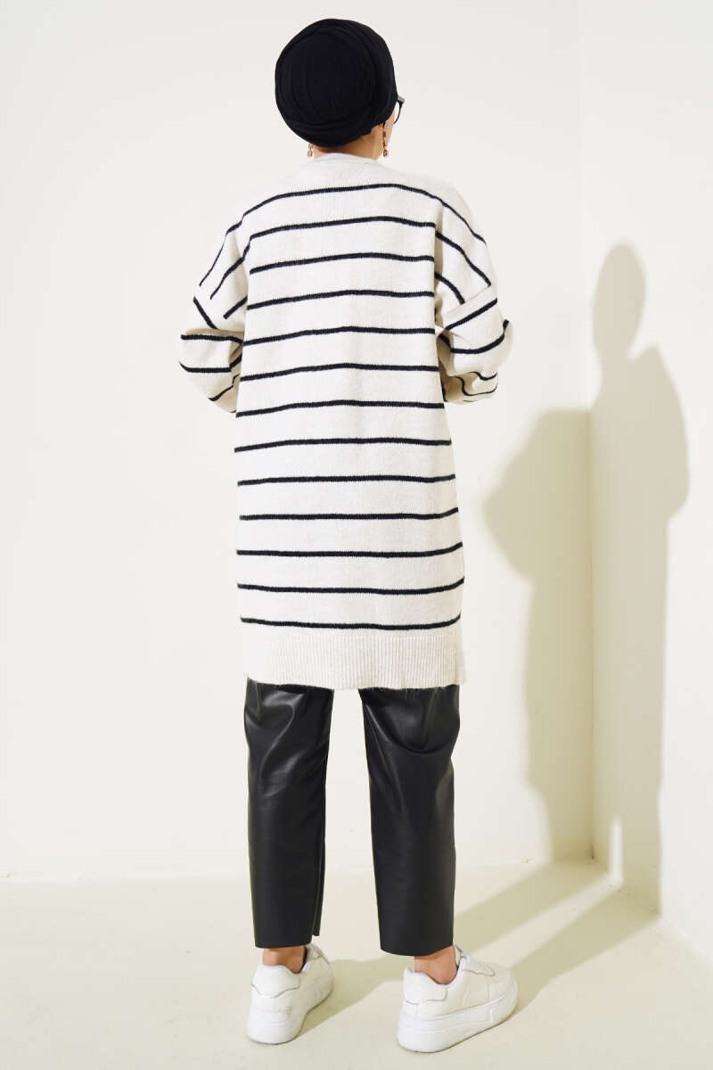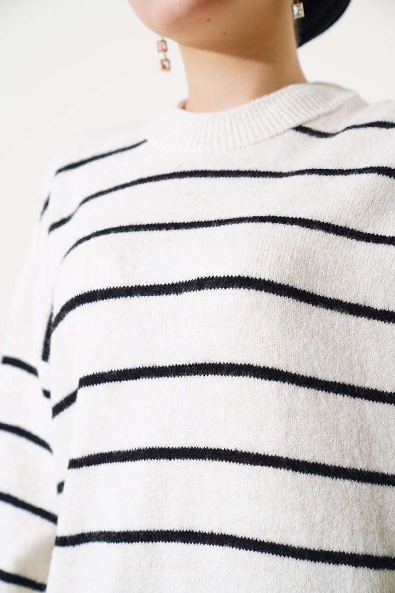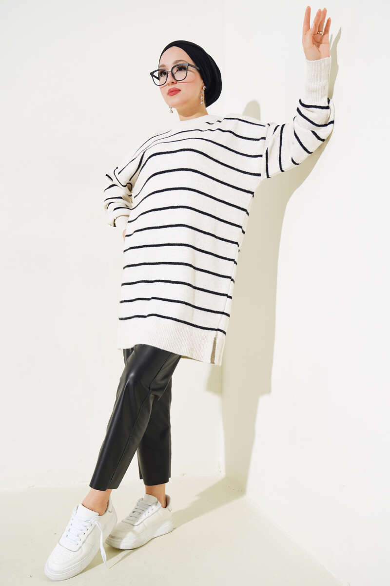 Gömlek Yaka Çizgili Triko Tunik Ekru