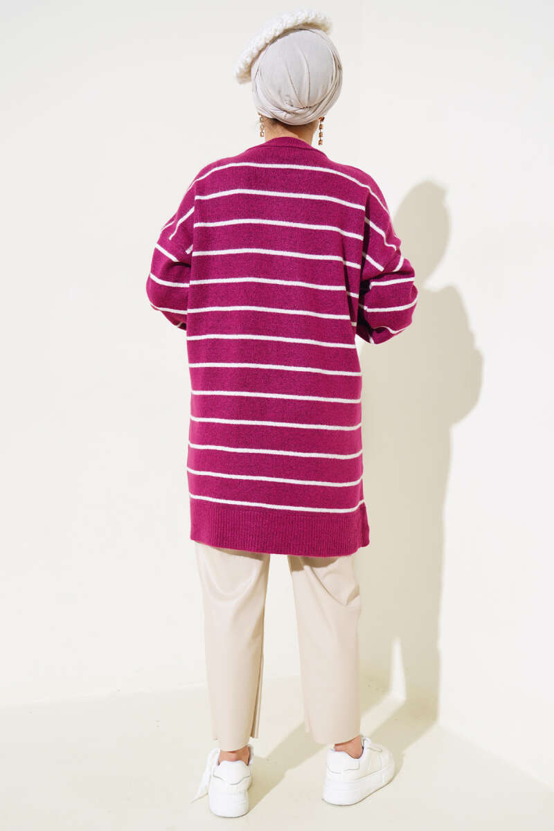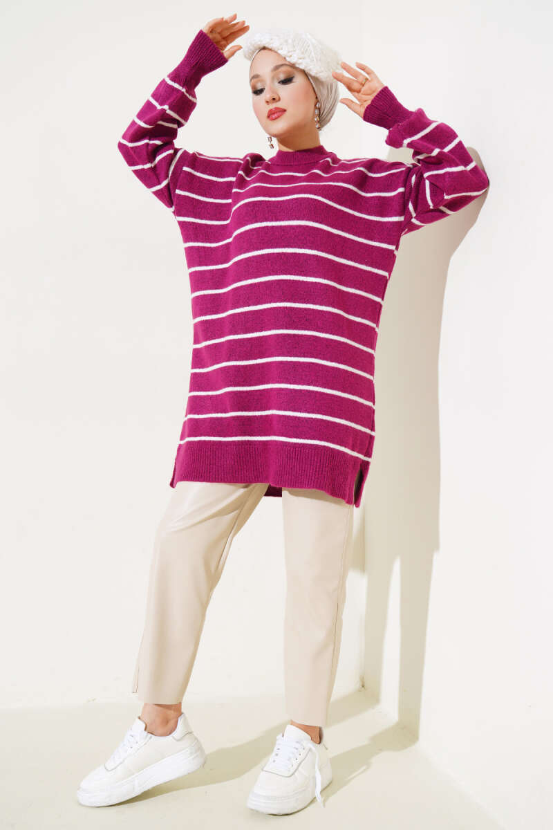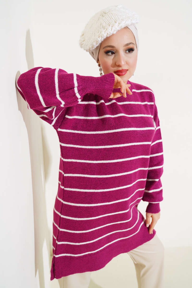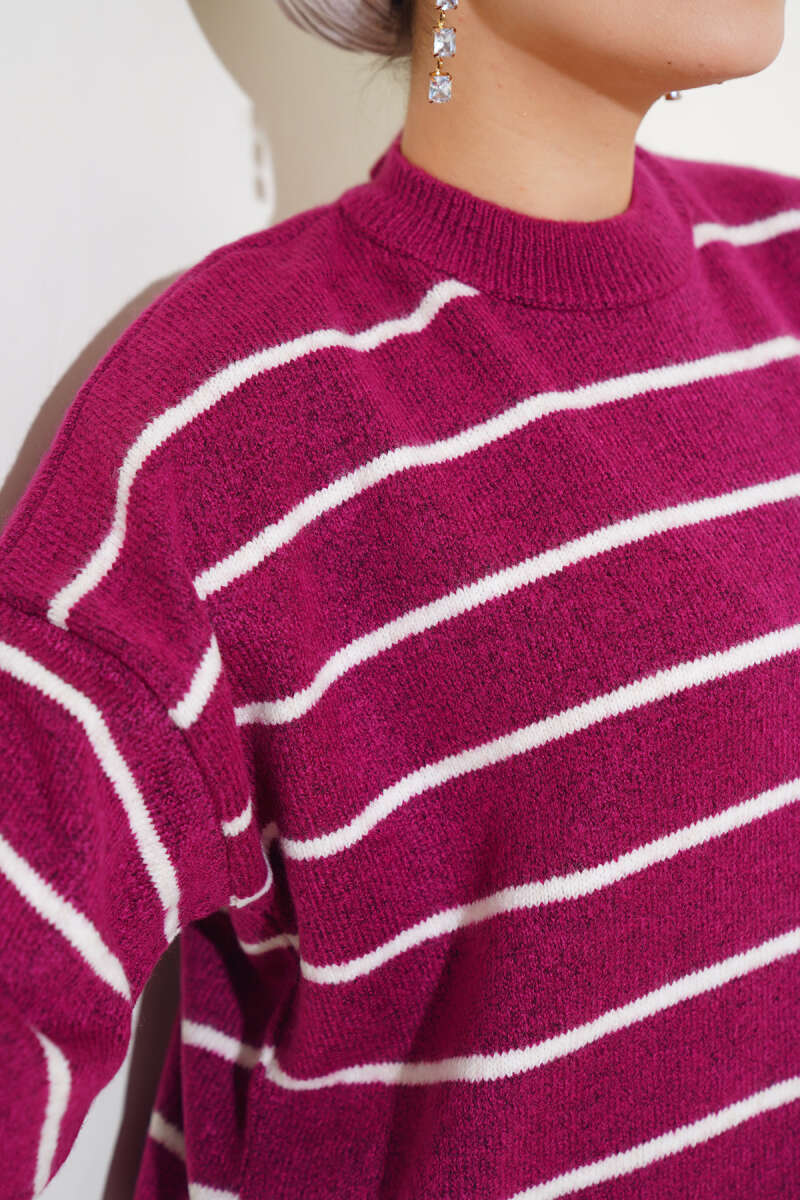 Gömlek Yaka Çizgili Triko Tunik Bordo