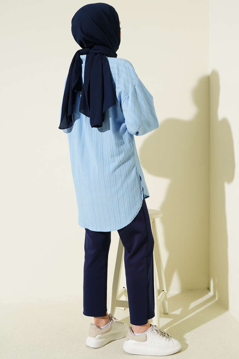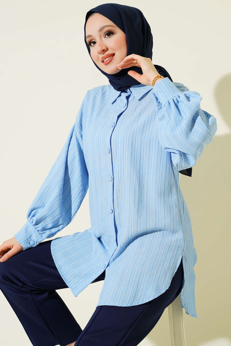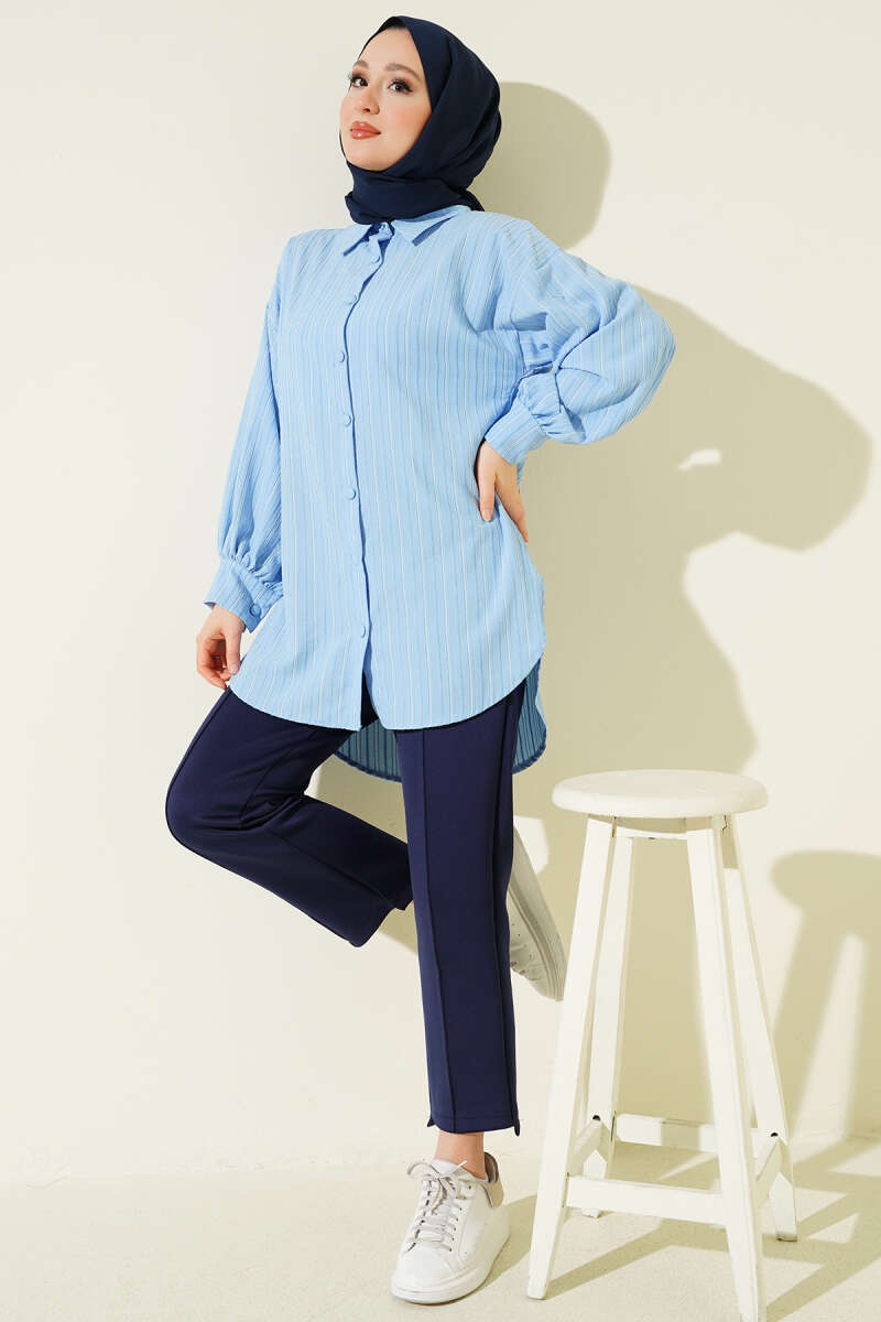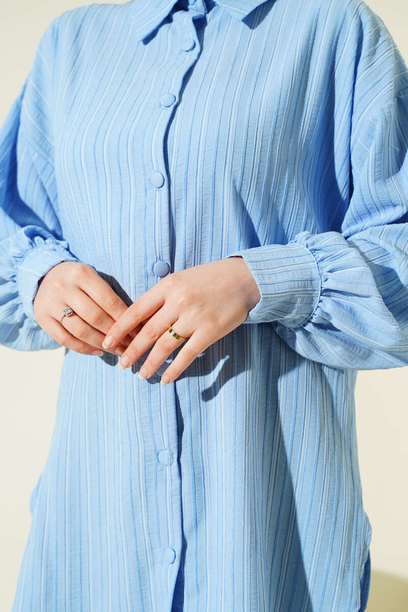 Çift Cepli Metal Düğmeli Gömlek Mavi