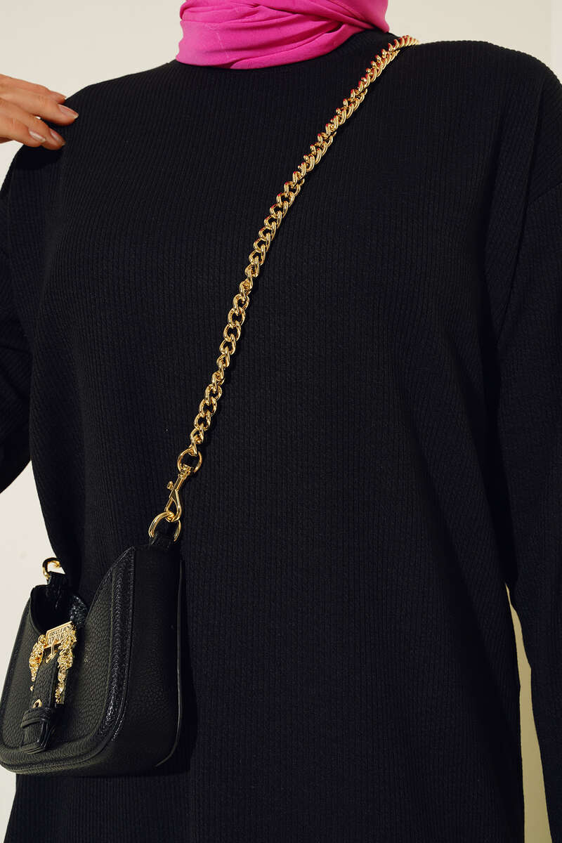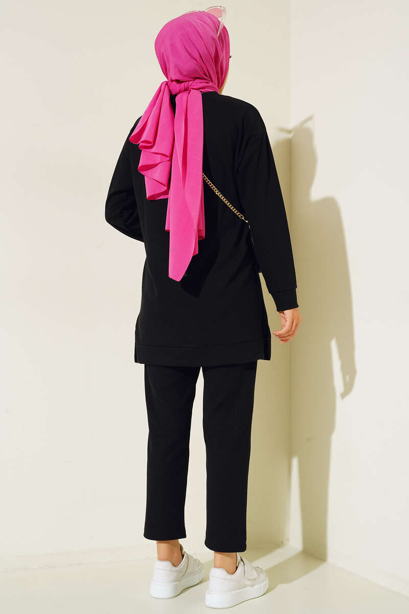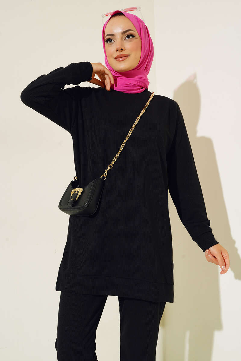Yeni sezon ince fitilli ikili takımımız tunik  ve pantolondan oluşmaktadır. İkili takımımızın tuniği düşük omuz salaş modeldir. Bisiklet yaka tuniğimizin etek uçları yanlarından yırtmaçlıdır. İkili takımımızın pantolonu bel lastiklidir. Cepsiz modeldir.