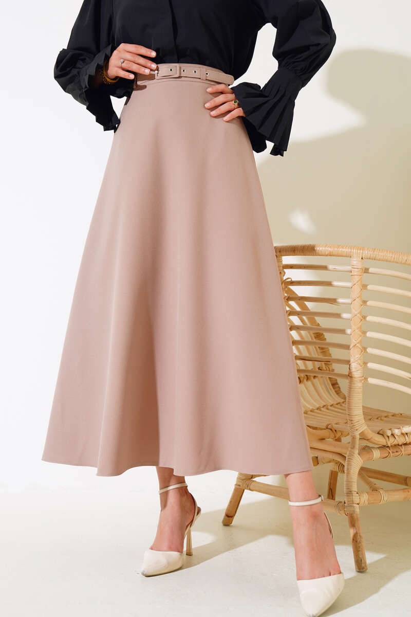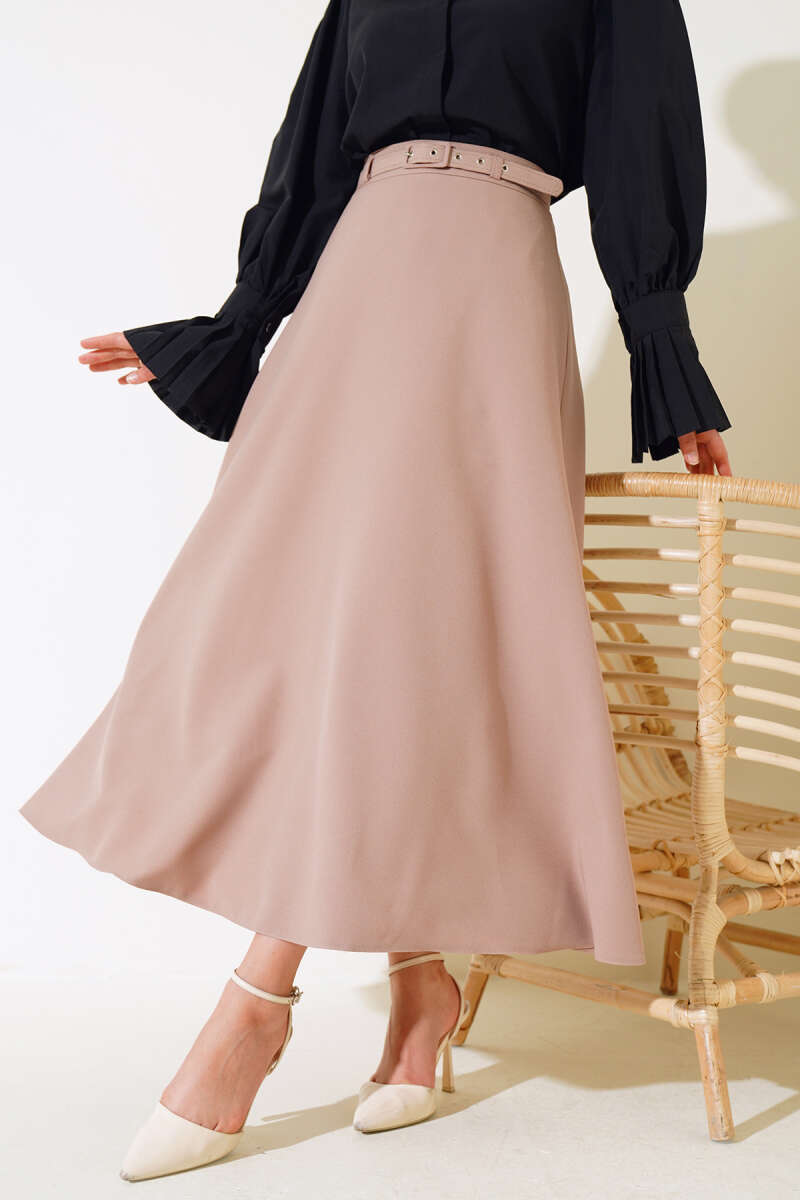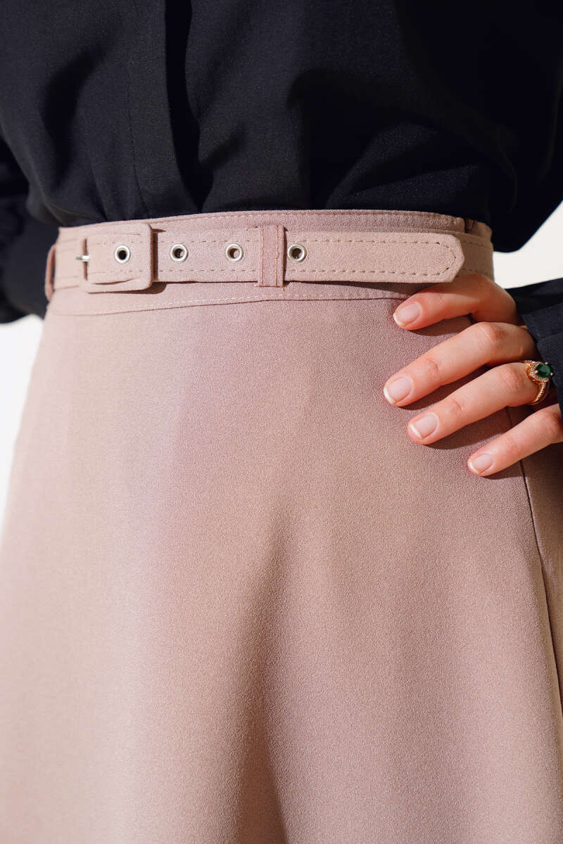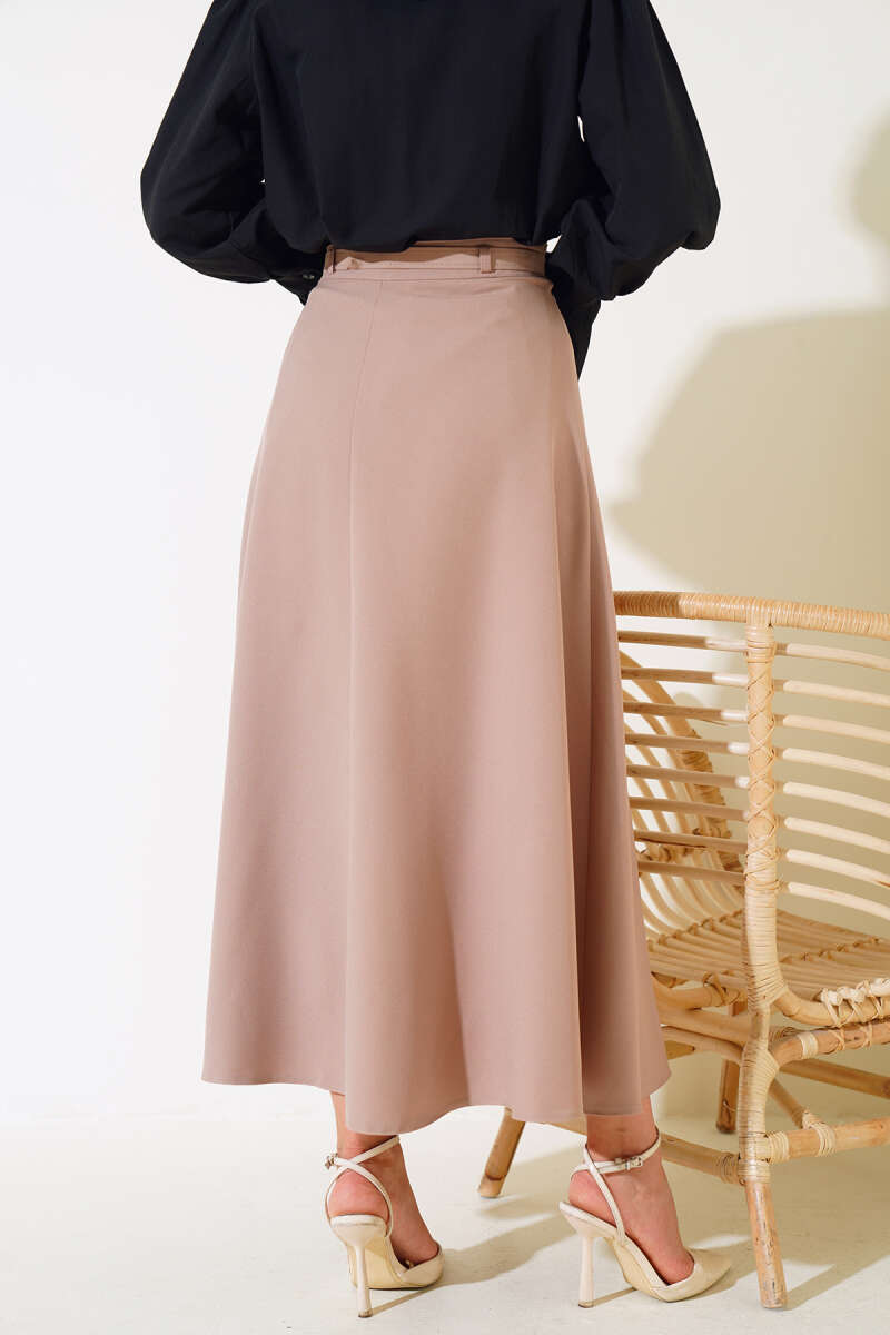 Kemer Aksesuarlı Ekoseli Etek Haki