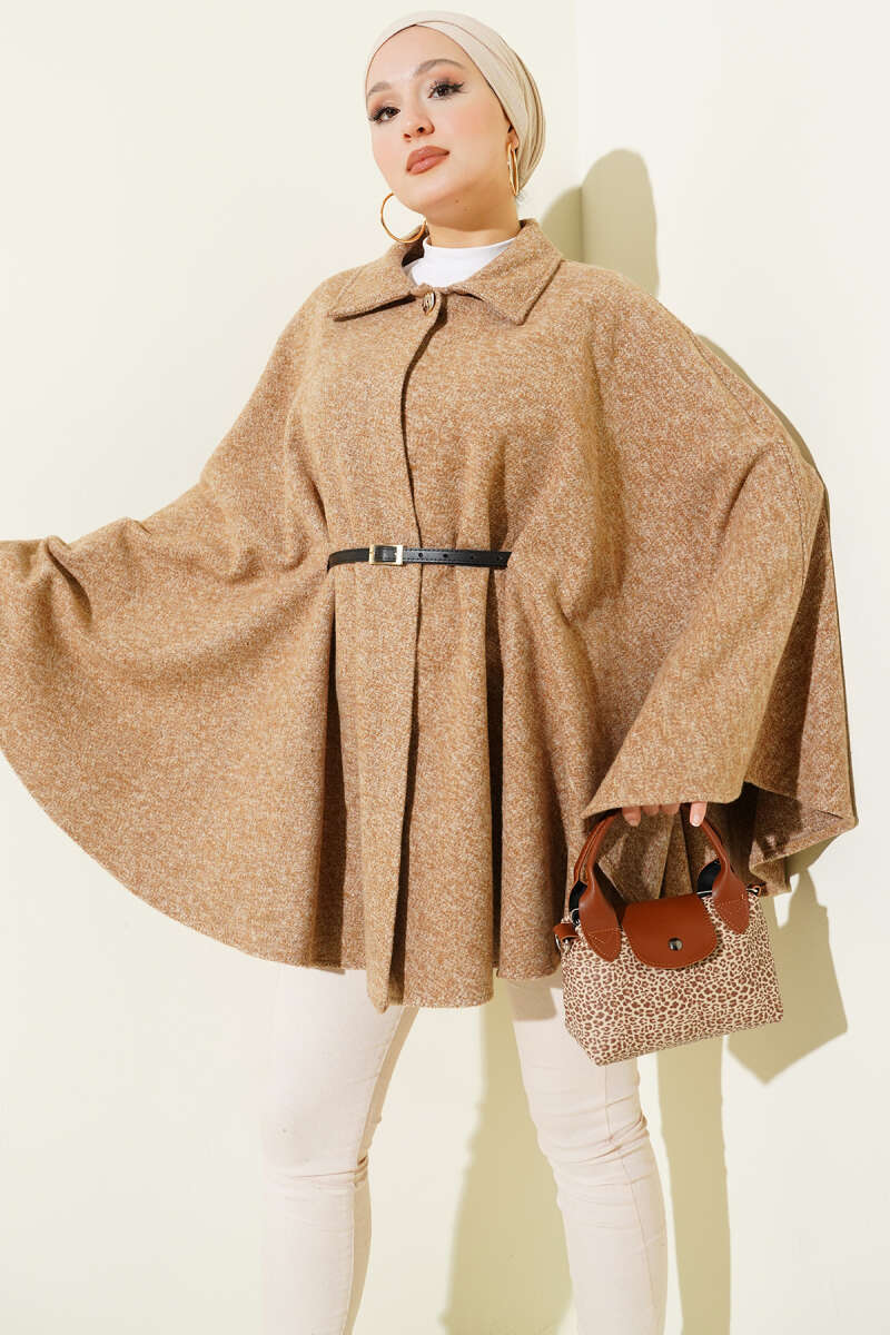 İnce Kemerli Gömlek Yaka Kaşe Panço Bej
