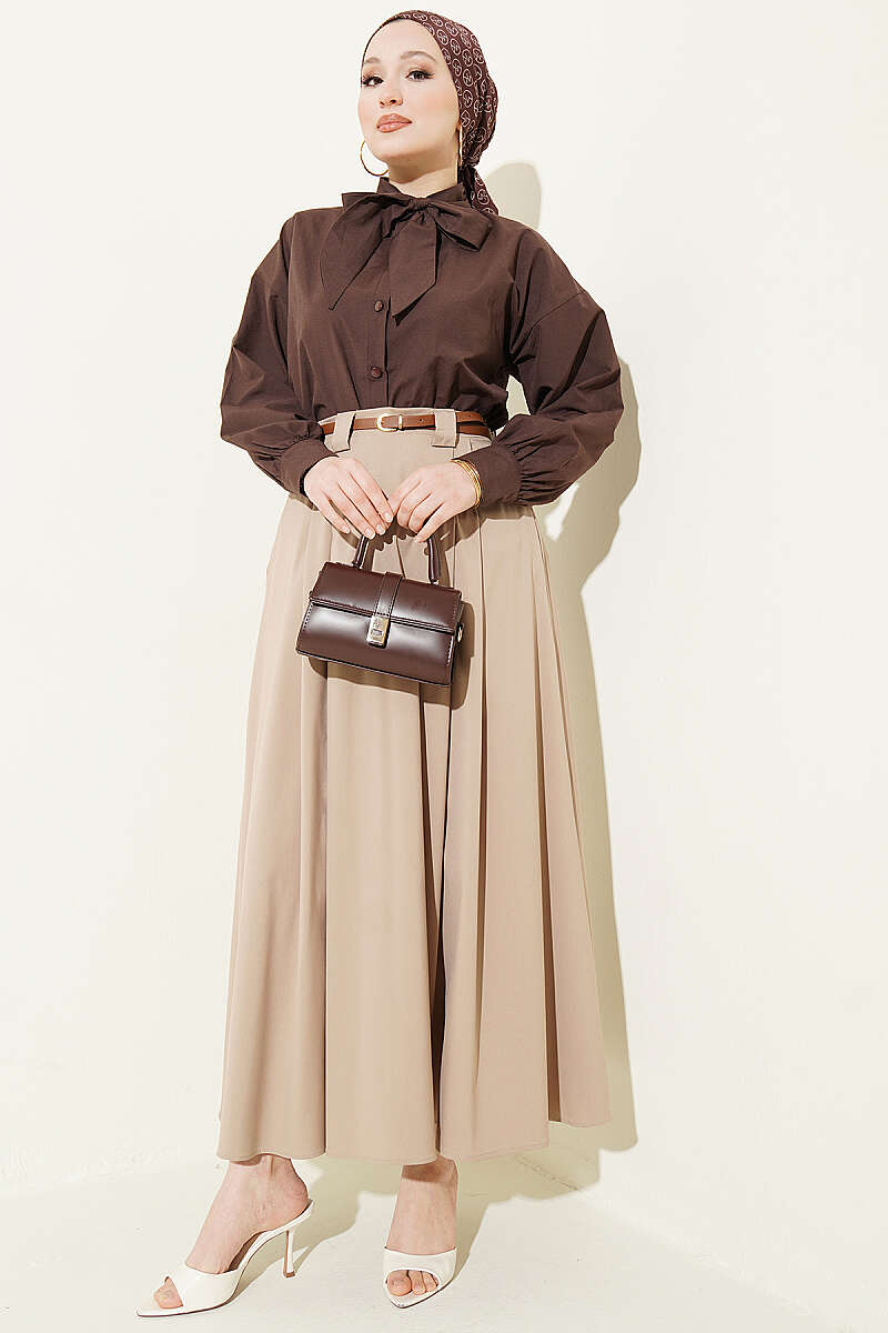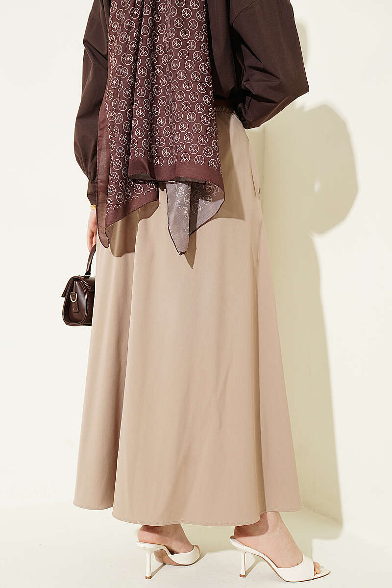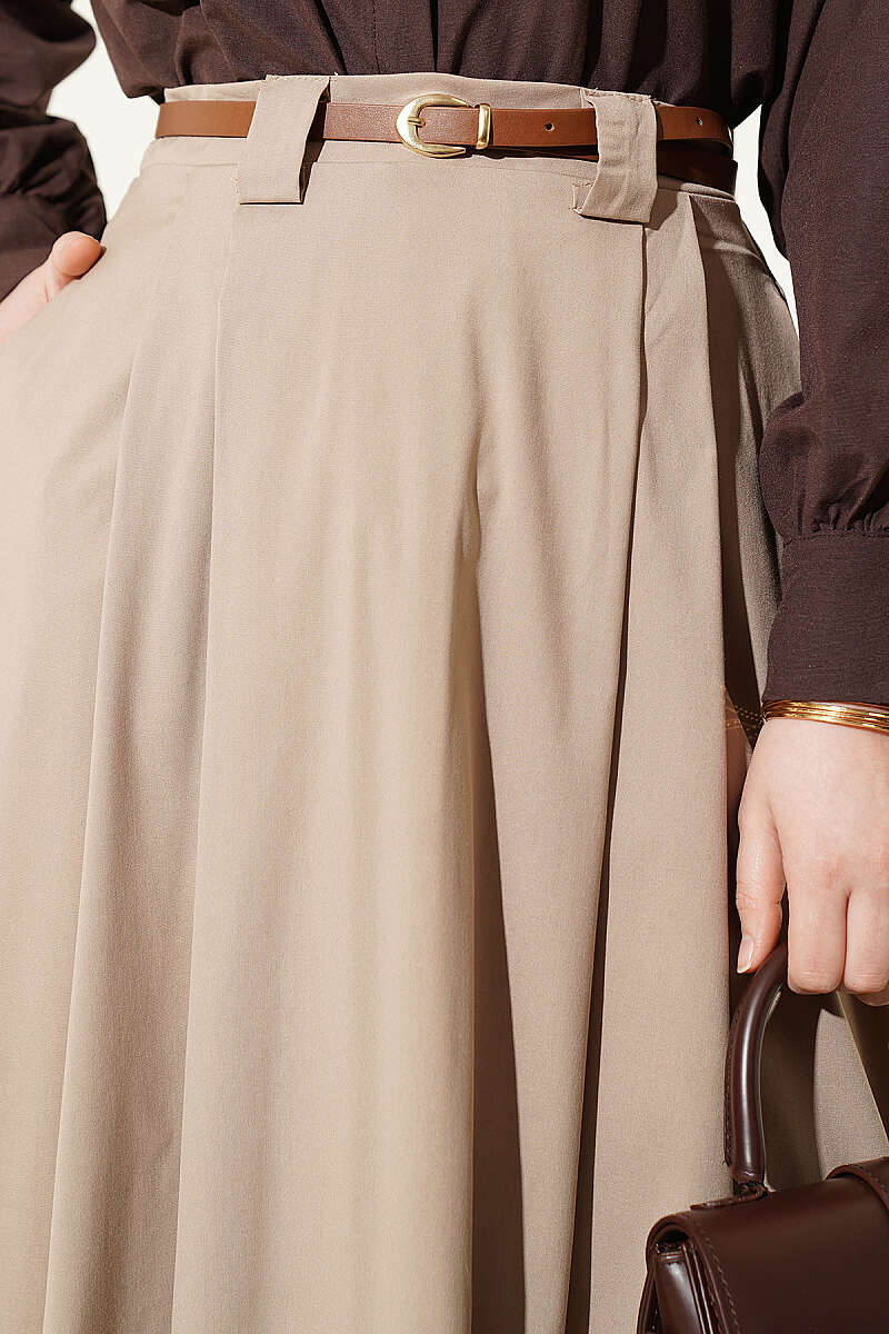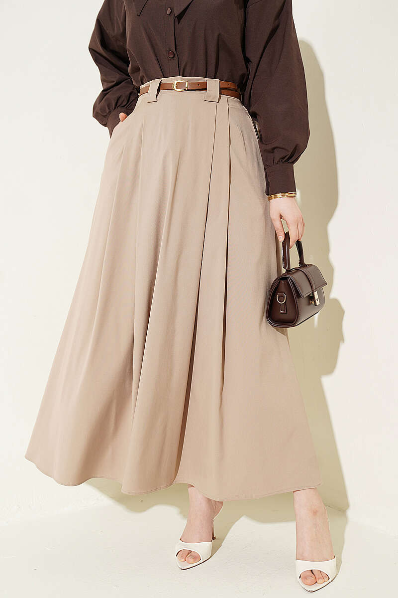 Kuşaklı Kat Detaylı Kloş Etek Bej