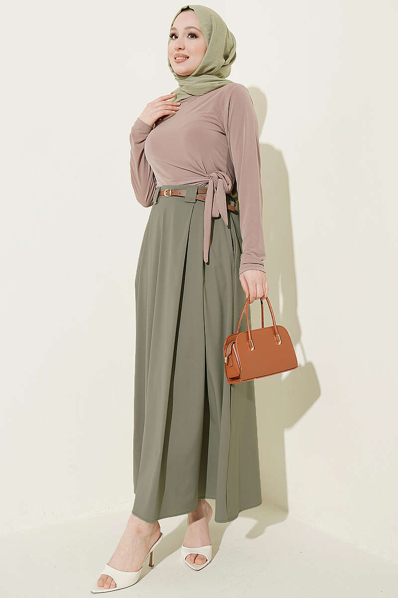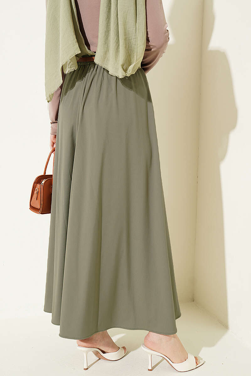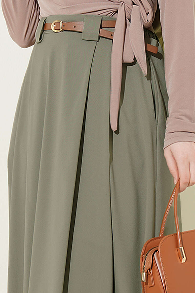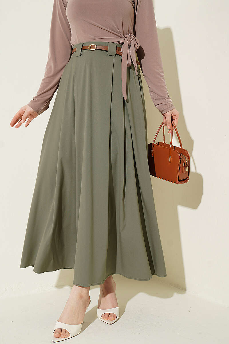 Kuşaklı Kat Detaylı Kloş Etek Haki